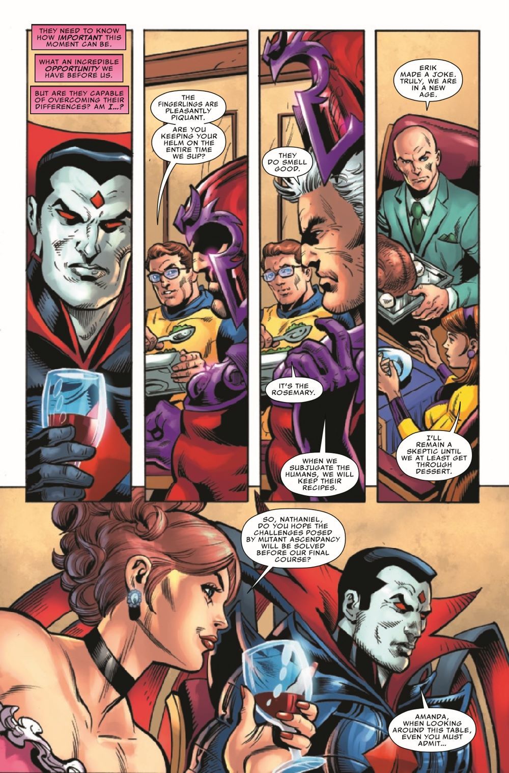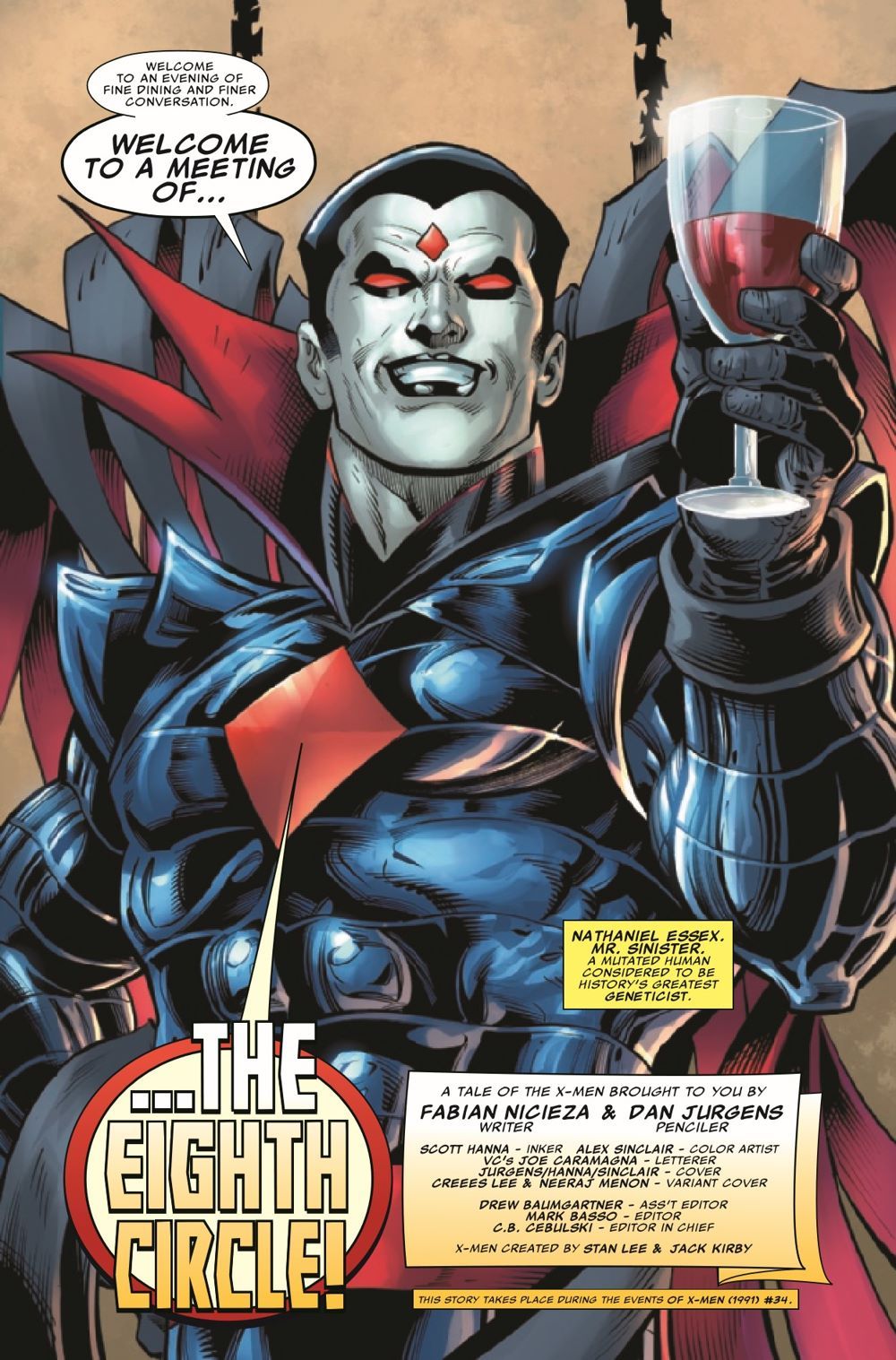 WHO WILL SURVIVE THE EIGHTH CIRCLE? CHARLES XAVIER. BEAST. AMANDA MUELLER. MOIRA MACTAGGERT. MAGNETO. Some of the greatest minds and experts on mutantkind are assembled by MR. SINISTER to discuss the evolution of Homo superior…but to what devious end?! Rest assured, there'll be at least one dead body before dessert at this meeting of the Eighth Circle! Dan Jurgens joins Fabian Nicieza as he returns to his original X-MEN run with an all-new tale set to startle and upend what you thought you knew about Sinister's machinations!