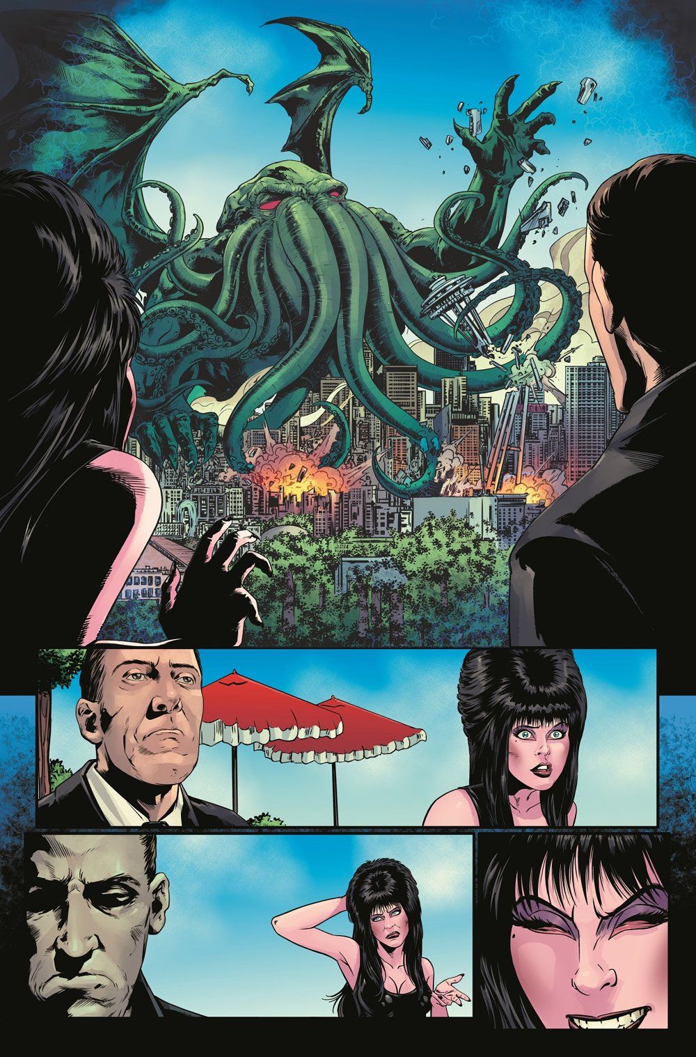 This series follows the riotous fun of Elvira in Horrorland and Elvira in Monsterland, which treated fans to the "Multiverse of Movies" and some incredible monster throwdowns. Now, both new readers and the Elvira-faithful can jump right into this story, and Lovecraft fans are welcome as well!