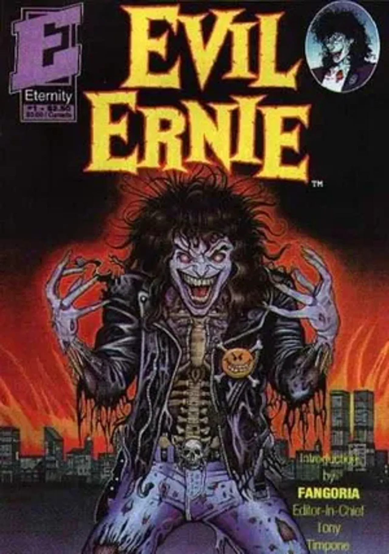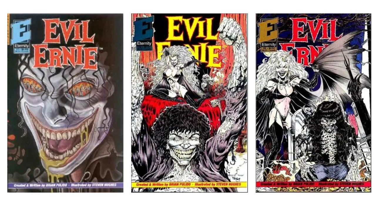 Evil Ernie made his debut in Evil Ernie #1, created by Brian Pulido and artist Steven Hughes under the guise of Eternity Comics. The story followed Ernest Fairchild, an adorable and lovable, yet severely abused and bullied child who develops extreme psychopathic issues while also possessing an ability to sketch and draw scenes that may come to pass. After an experimental procedure in a mental institution introduces Ernest to Lady Death in a dream in the Endless Graveyard, he abruptly murders his parents (his core abusers), as well as 35 other people on his street, and promptly loses his sanity.