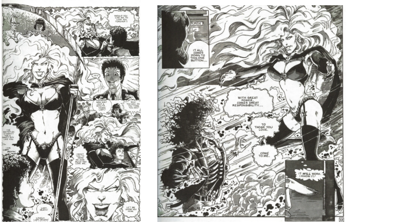 To look upon the chromium-clad warrior pose of Lady Death #1 with your living eyes is to stare directly into the molten heart of tragic fantasy. In these pages, Lady Death recounts her transformation from Hope, a medieval girl whose father sought to overthrow Hell itself. In a desperate bid to escape execution at a fiery stake, she bargains with the underworld and is thrust into the conflict between her father and Lucifer. In the end, she conquers the Devil by absorbing his power, only to be cursed to remain in Hell until all humanity is gone.