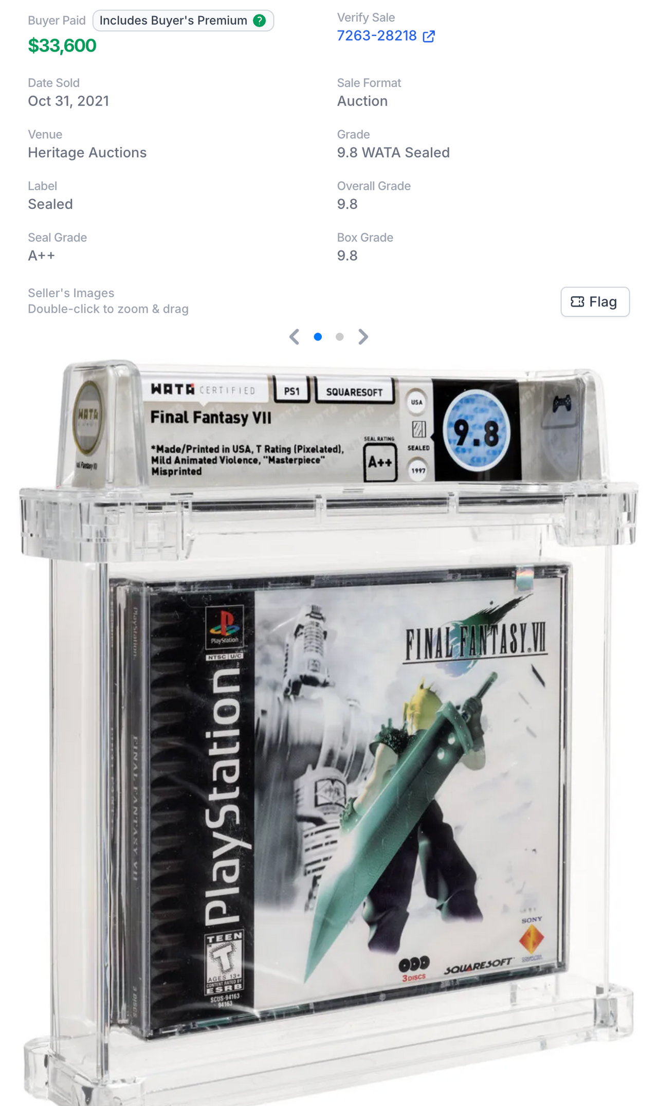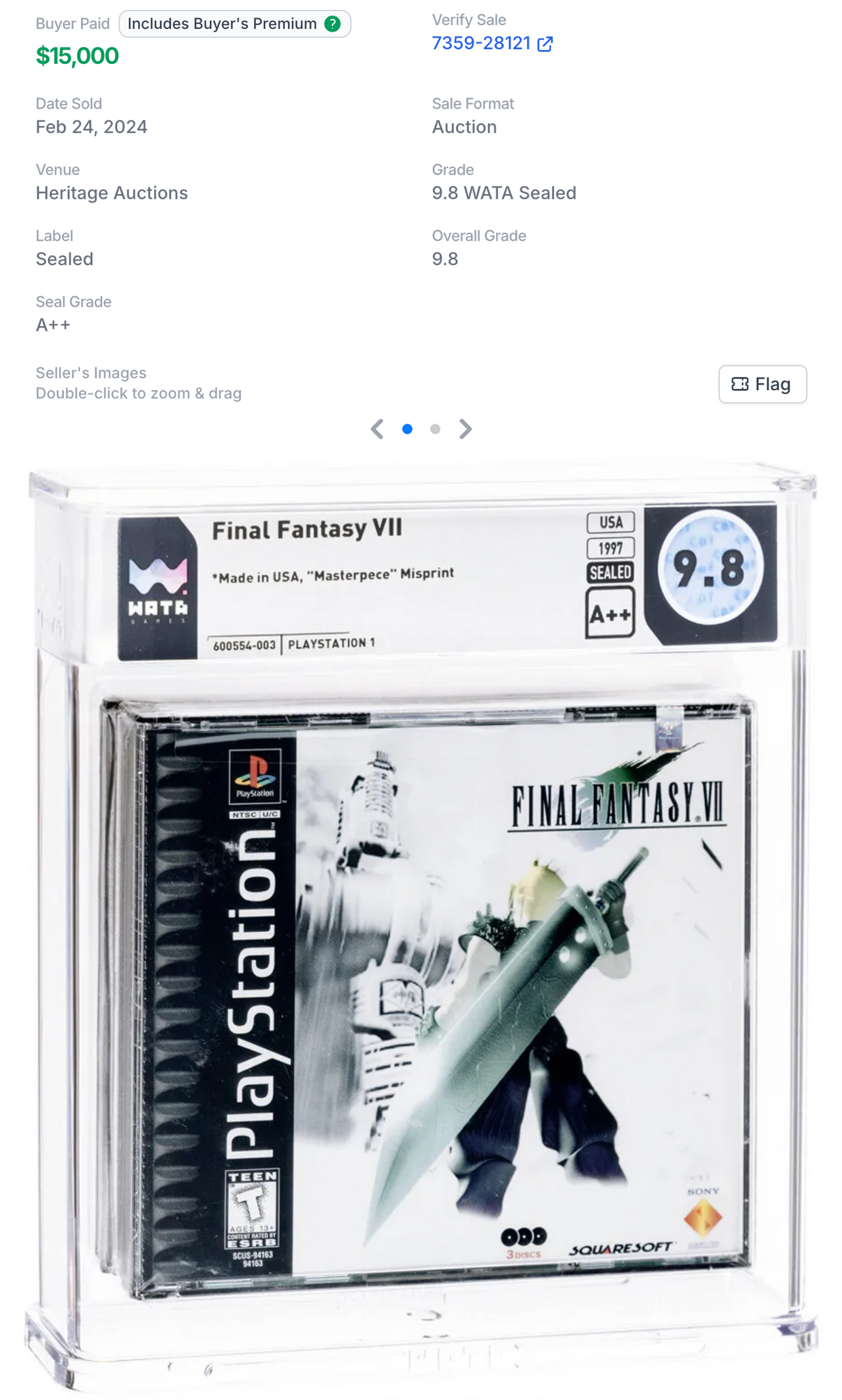 Since then, like the rest of the collectibles market, the value of FFVII has gone through a major correction; by November 2022, the present dollar value of a sealed Wata 9.8 had fallen precipitously to $3,630: