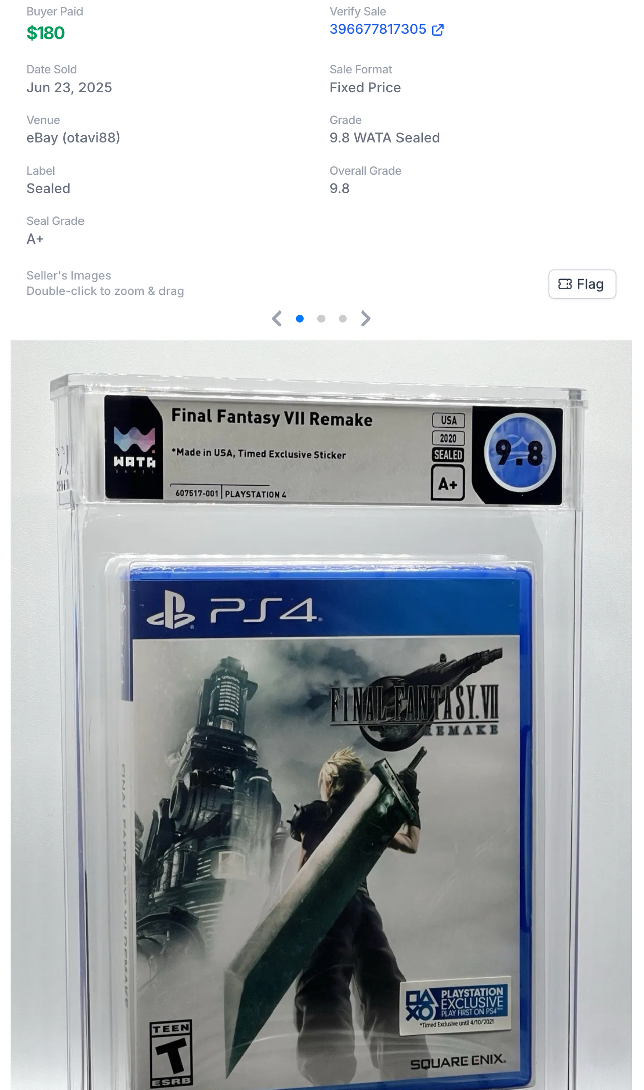 If in pristine condition, even copies of FFVII Remake can sell for hundreds of dollars. For instance, this WATA 9.8 A+ copy of FFVII Remake sold for a solid $180 back in June 2025: