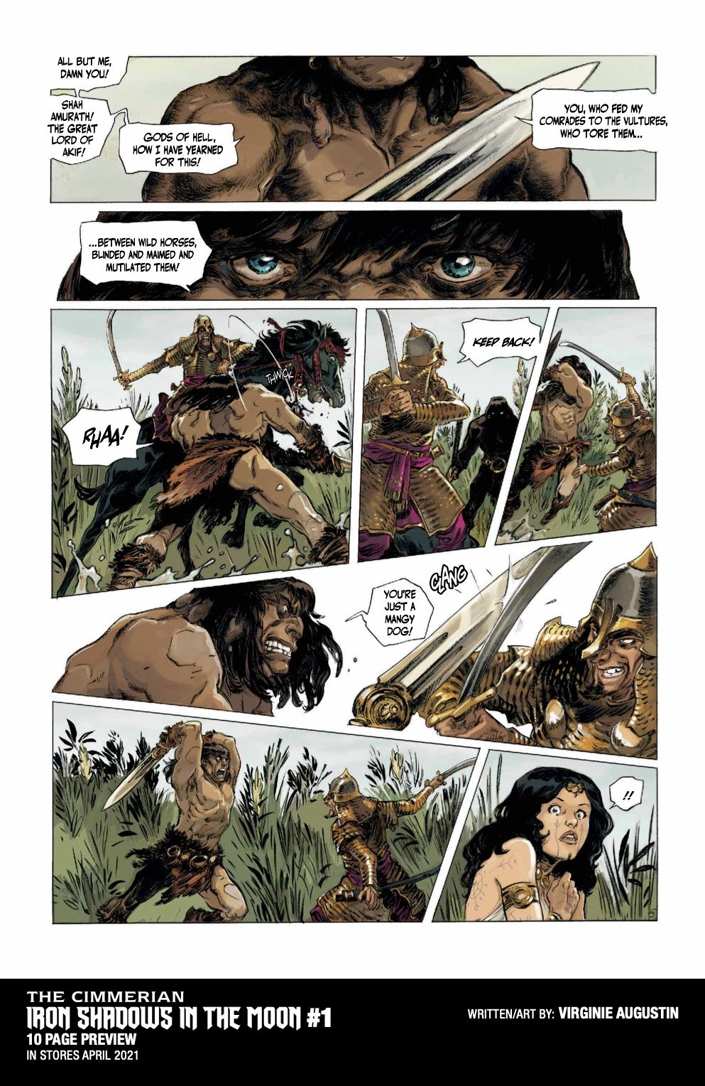 THE CIMMERIAN: IRON SHADOWS IN THE MOON #1 will be solicited in the Jan 2021 issue of Diamond Previews for April 2021 shipping items, with an on-sale date of 4/7/21. Issue 1 will feature cover art by Virginie Augustin, as well as Brian Level, Kajo Baldisimo, and Fritz Casas. Retailers can reach out to Diamond or ABLAZE regarding special offers and promotions for the series, including retailer exclusive covers.