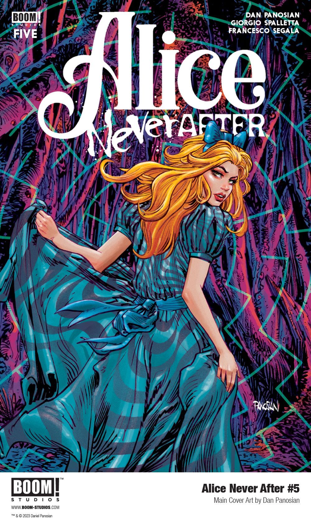 Media Release -- BOOM! Studios today revealed a first look at ALICE NEVER AFTER #5, the FINAL issue of the five-issue original series from superstar artist and writer Dan Panosian (An Unkindness of Ravens, Canary), artist Giorgio Spalletta (007: For King and Country), colorist Francesco Segala, and letterer Jeff Eckleberry. Continue to blur the lines between fantasy and reality in ALICE NEVER AFTER, available November 2023.