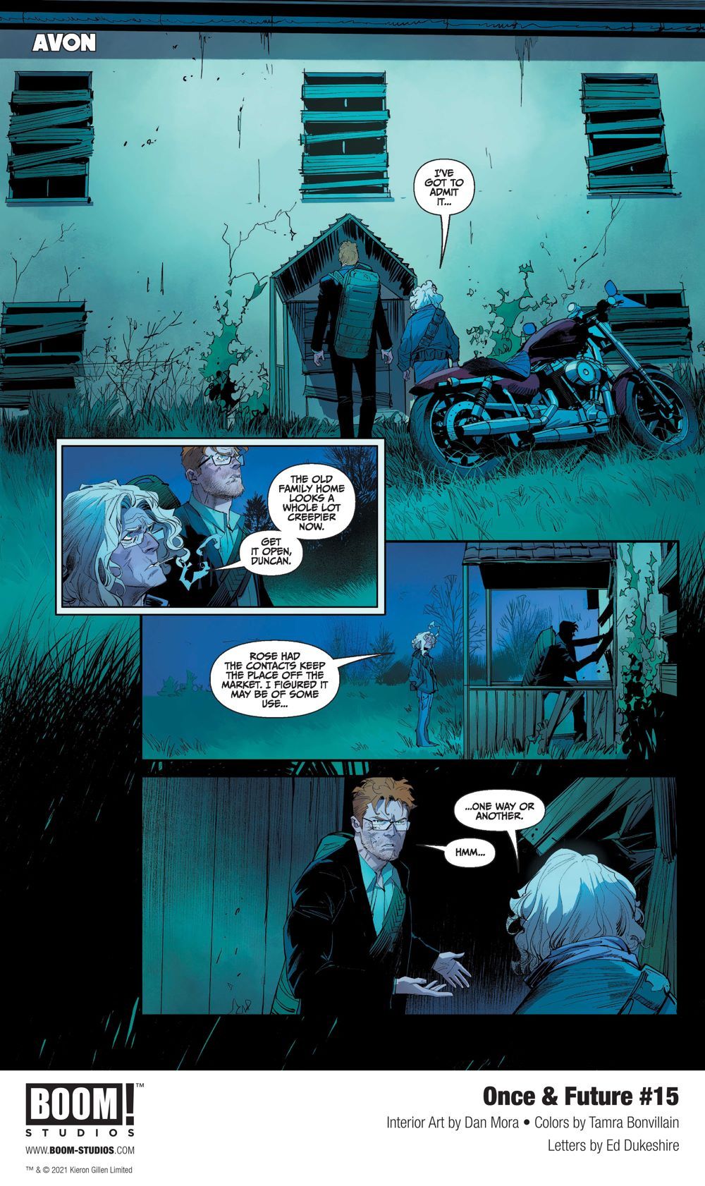 Media Release -- BOOM! Studios revealed today a first look at ONCE & FUTURE #15, continuing a new story arc in the critically acclaimed series from New York Times bestselling writer Kieron Gillen (The Wicked + The Divine, Star Wars), Russ Manning Award-winning artist Dan Mora (Buffy the Vampire Slayer, Klaus), colorist Tamra Bonvillain (Captain Marvel), and letterer Ed Dukeshire (The Red Mother), about retired monster hunter Bridgette McGuire, her unsuspecting grandson Duncan, and their intrepid ally Rose who protect their nation from legends and myths risen from the grave to battle for dominion over the land.