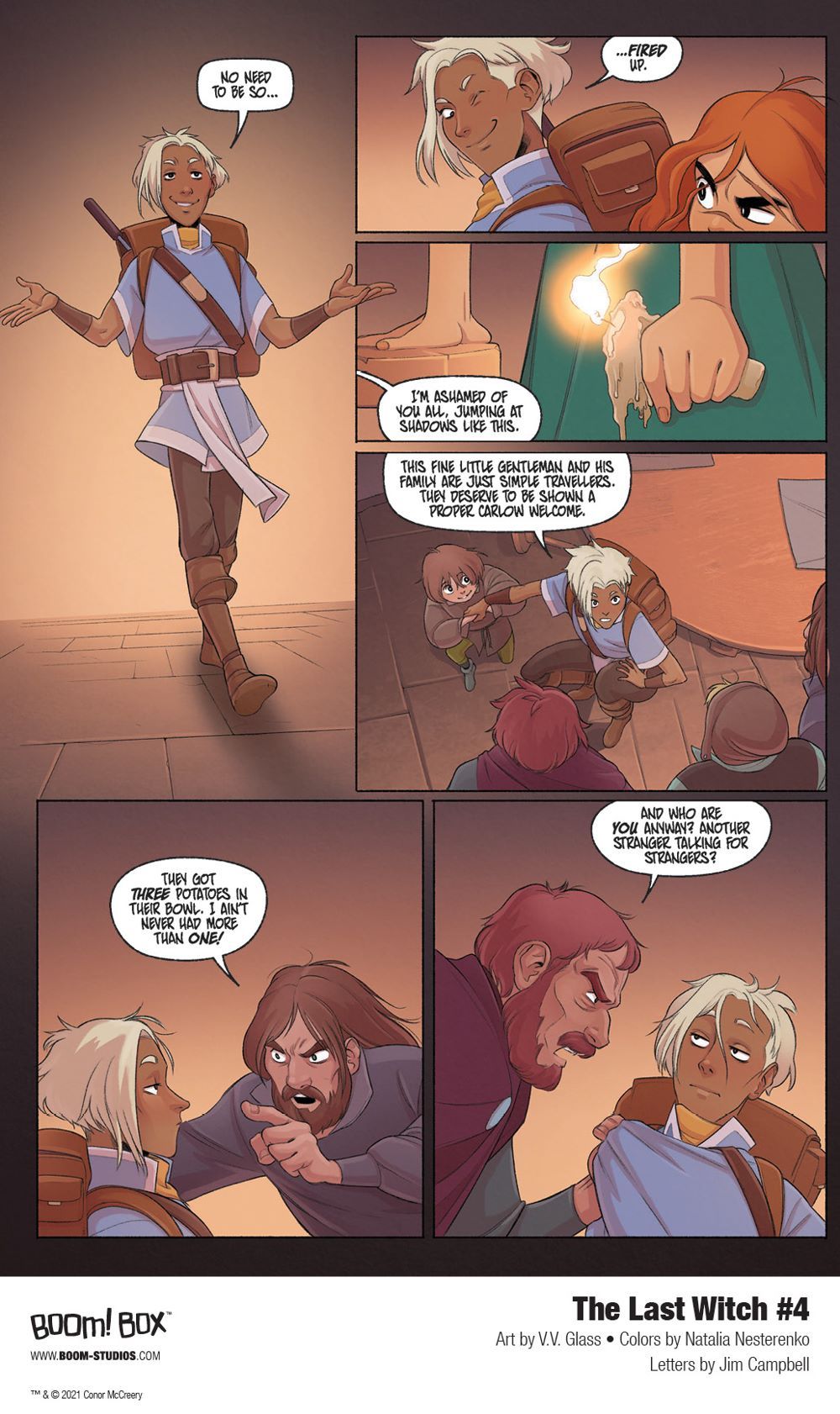 Media Release -- BOOM! Studios today revealed a first look at THE LAST WITCH #4, the next issue of the brand new original series from writer Conor McCreery (Kill Shakespeare), artist V.V. Glass, colorist Natalia Nesterenko, and letterer Jim Campbell, a young adult fantasy comic book series that shows that the greatest magic of all lies inside of us, available in April 2021.