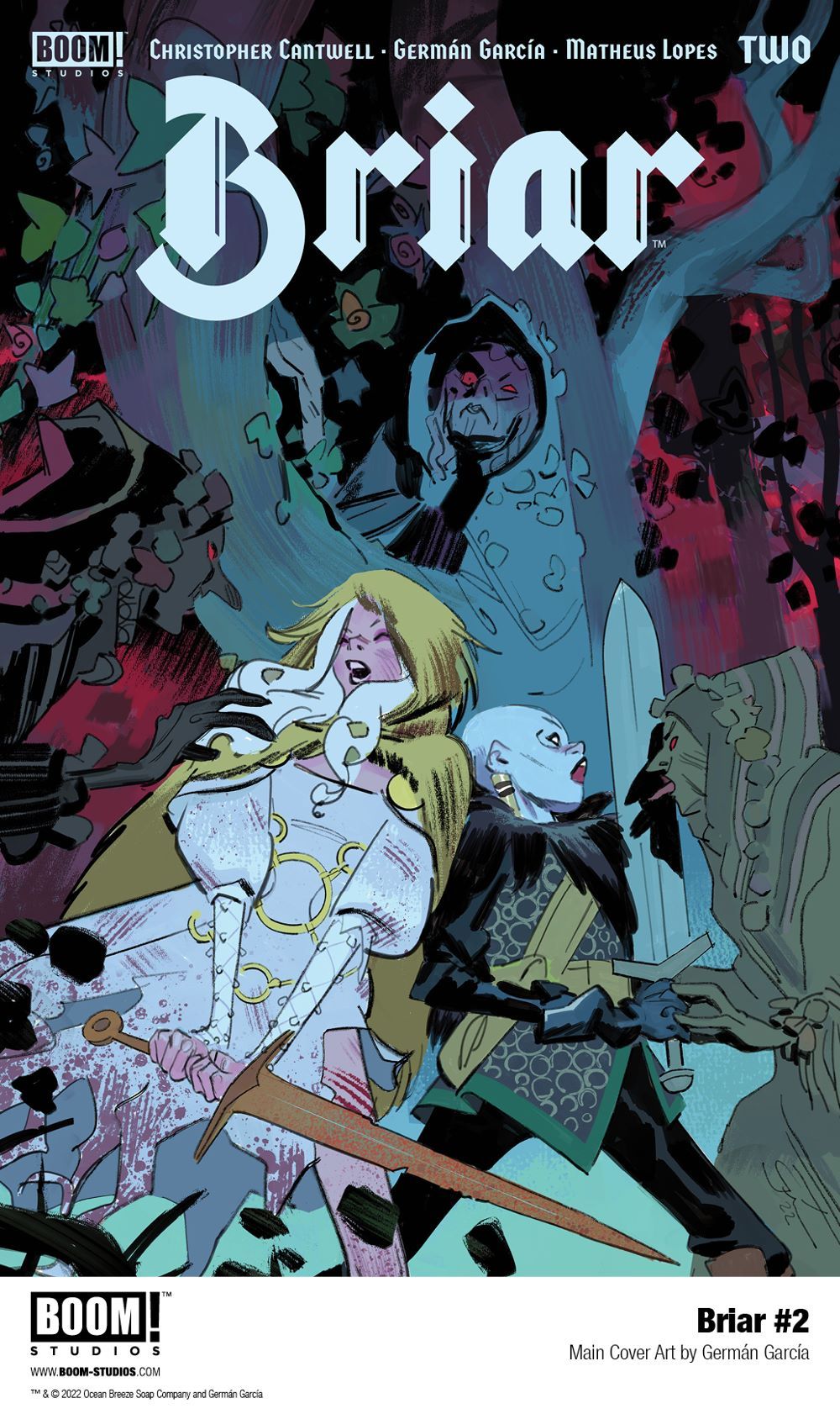 Media Release -- BOOM! Studios revealed today a first look at BRIAR #2, the second issue of the brand new four-issue limited comic book series from Eisner Award-nominated writer, producer, and director Christopher Cantwell (Regarding the Matter of Oswald's Body, Iron Man, Halt and Catch Fire), rising star artist Germán García (Ka-Zar: Lord of the Savage Land), colorist Matheus Lopes (Supergirl: Woman of Tomorrow), and letterer AndWorld Design (The Many Deaths of Laila Starr) that reimagines the classic fairy tale as an epic dark fantasy adventure, available November 2022.