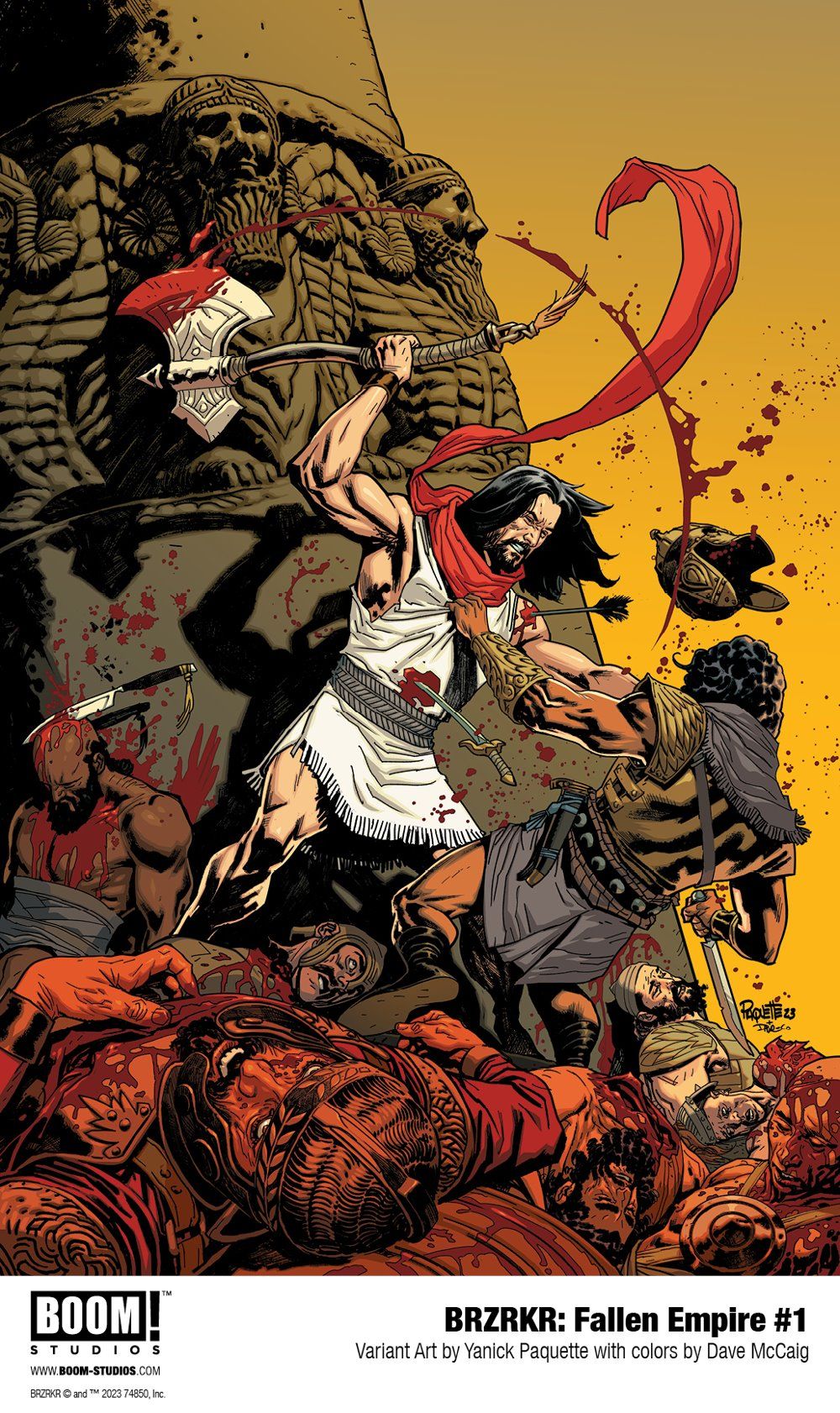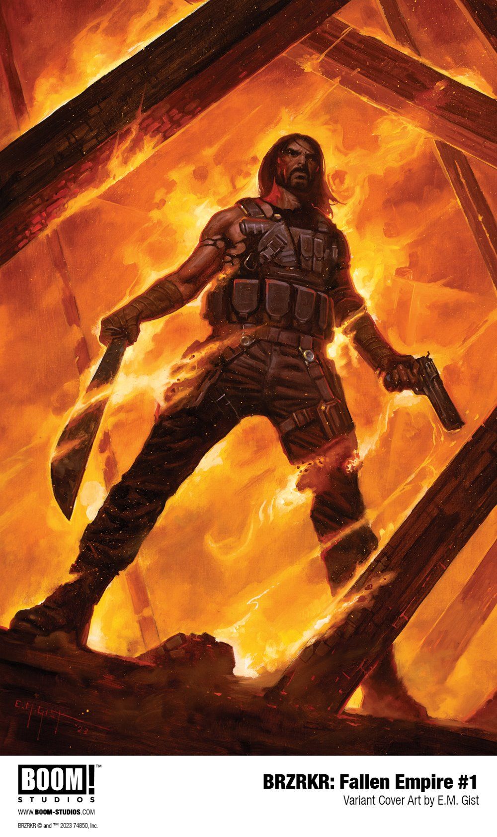 BRZRKR: FALLEN EMPIRE is the newest release from BOOM! Studios' eponymous imprint, home to critically acclaimed original series, including BRZRKR by Keanu Reeves, Matt Kindt, and Ron Garney; Something is Killing the Children by James Tynion IV and Werther Dell'Edera; Grim by Stephanie Phillips and Flaviano; Stuff of Nightmares by R.L. Stine and A.L. Kaplan; Damn Them All by Simon Spurrier and Charlie Adlard; Once Upon a Time at the End of the World by Jason Aaron, Alexandre Tefenkgi, Leila del Duca, and Nick Dragotta; Know Your Station by Sarah Gailey and Liana Kangas; A Vicious Circle by Mattson Tomlin and Lee Bermejo; The Neighbors by Jude Ellison S. Doyle and Letizia Cadonici; Ghostlore by Cullen Bunn and Leomacs; Sirens of the City by Joanne Starer and Khary Randolph; Coda by Simon Spurrier and Matías Bergara; Rare Flavours by Ram V and Filipe Andrade, and the upcoming Underheist by David and Maria Lapham. The imprint also publishes popular licensed properties, including Dune: House Harkonnen from Brian Herbert, Kevin J. Anderson, and Michael Shelfer; Mighty Morphin Power Rangers by Melissa Flores and Simona Di Gianfelice; and The Expanse: Dragon Tooth by Andy Diggle and Rubine.