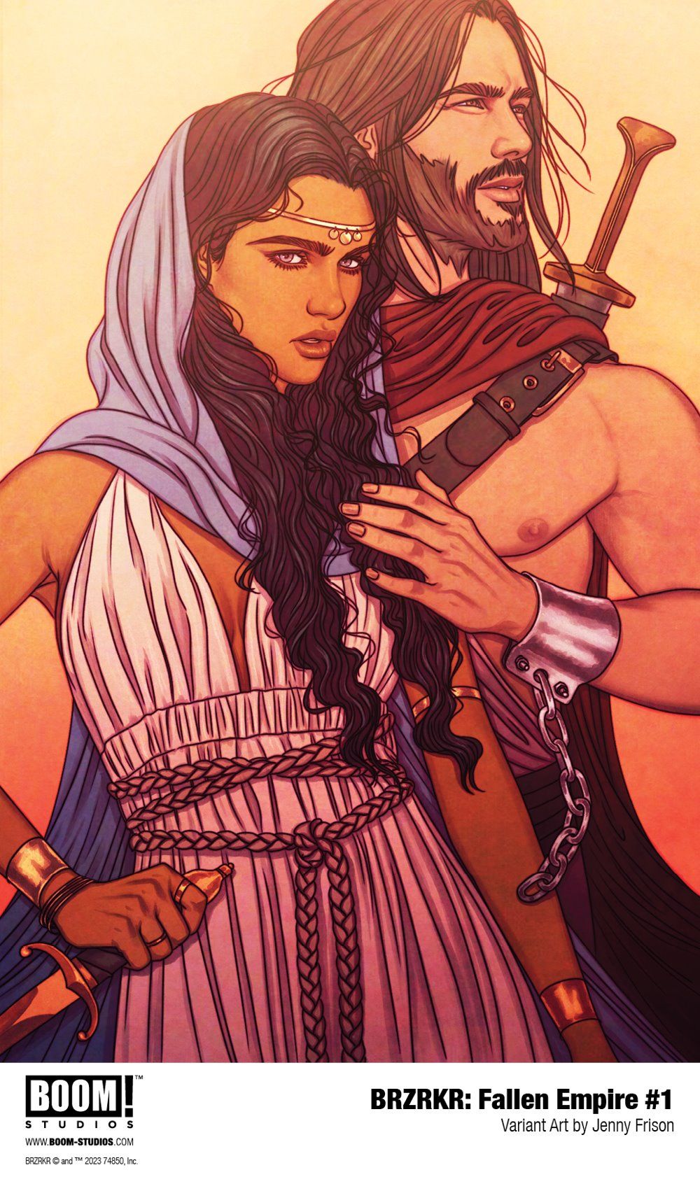 BRZRKR: FALLEN EMPIRE #1 features a main cover by Rebekah Isaacs with colors by Jordie Bellaire, with variants by Joëlle Jones (Lady Killer), Jenny Frison (Alice Never After), Yanick Paquette (The Dreaming), and E.M. Gist (Something is Killing the Children).