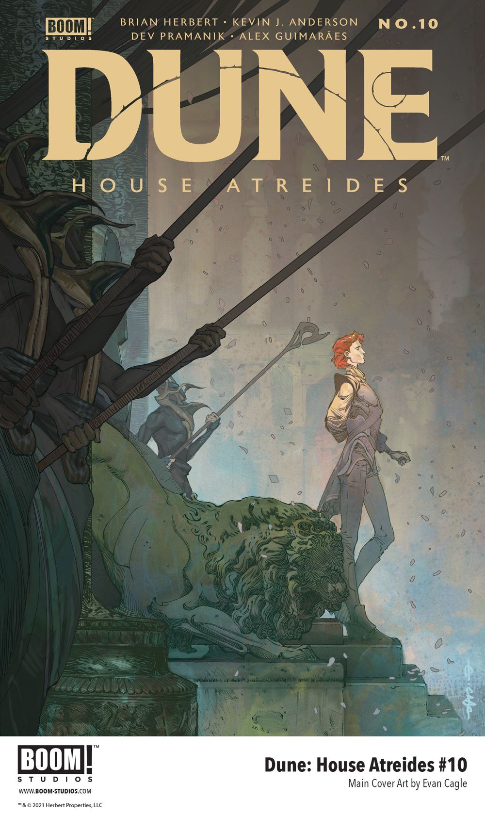 Media Release -- BOOM! Studios today revealed a first look at DUNE: HOUSE ATREIDES #10, adapted & scripted by Brian Herbert and Kevin J. Anderson, who co-wrote the eponymous prequel novel based on Frank Herbert's notes and illustrated by artists Dev Pramanik (Paradiso) and Mariano Taibo, colorist Alex Guimarães (Bone Parish), and letterer Ed Dukeshire (Once & Future), in partnership with Herbert Properties LLC and in full coordination with Abrams ComicArts, who published the first of three graphic novel adaptations of Herbert's original classic novel DUNE in Fall 2020.