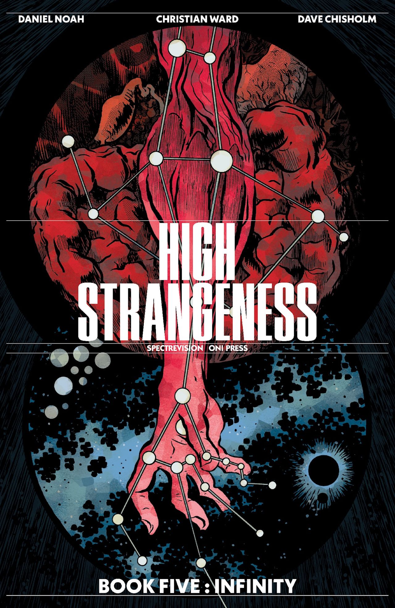 Media Release -- WELCOME, TRAVELER. YOU ARE ABOUT TO PASS THROUGH THE FINAL GATEWAY … AND ALL WILL BE REVEALED! Oni Press, the multiple Eisner and Harvey Award–winning publisher of groundbreaking comics and graphic novels since 1997 and SpectreVision, the genre-distorting production company founded by Elijah Wood and Daniel Noah are proud to present your first look inside HIGH STRANGENESS: BOOK FIVE! Everything we have witnessed thus far – from sightings of Men in Black in 1967 through to psychic test subjects tasked with unlocking alien secrets in 2001 and more perplexing phenomena – has led to this point … and now series creator Daniel Noah is joined by multiple Eisner Award winner Christian Ward (Batman: City of Madness) to finally reveal the unspoken truth that connects each episode of HIGH STRANGENESS across time, space and a hierarchy of confounding new dimension beyond all human understanding.