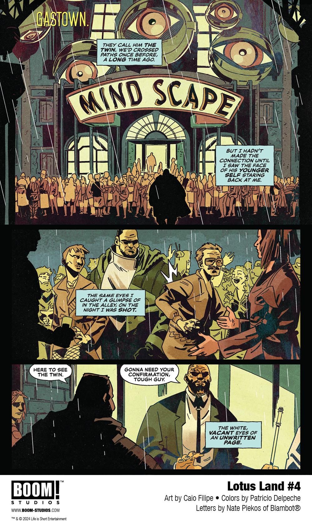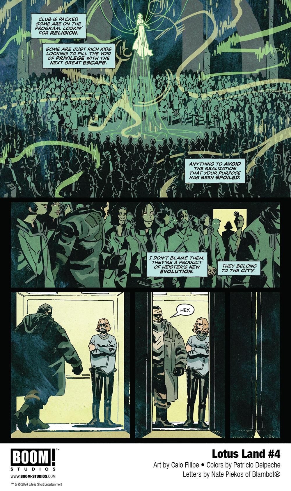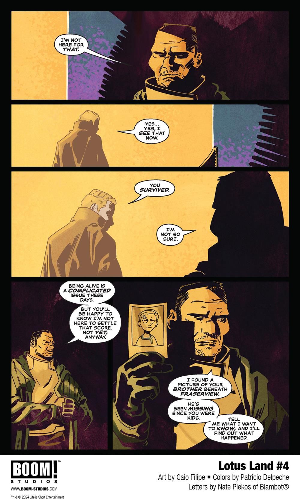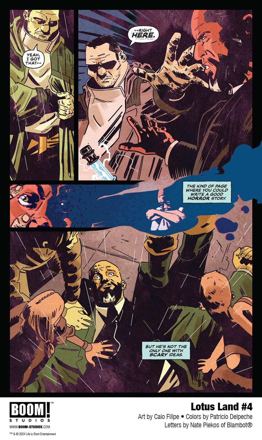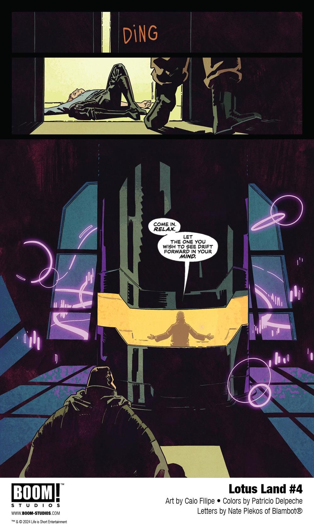 Media Release -- BOOM! Studios today revealed a first look at LOTUS LAND #4. Eisner-winning and Harvey-nominated writer and director Darcy Van Poelgeest (Little Bird) is joined by artist Caio Filipe (Stranger Things: Tales From Hawkins), colorist Patricio Delpeche (Angel), and letterer Nate Piekos of Blambot® (The Seasons Have Teeth) for a timely look at the human condition, set in a dystopic, cyberpunk future that's as grounded as it is metaphysical. Welcome to LOTUS LAND, available February 2024.