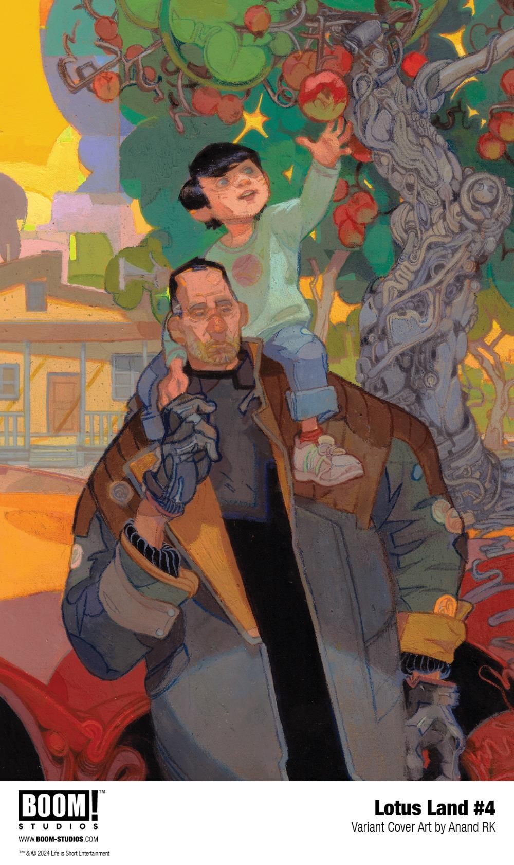 LOTUS LAND is the newest release from BOOM! Studios' eponymous imprint, home to critically acclaimed original series, including BRZRKR by Keanu Reeves, Matt Kindt, and Ron Garney; Something is Killing the Children by James Tynion IV and Werther Dell'Edera; Grim by Stephanie Phillips and Flaviano; Stuff of Nightmares by R.L. Stine and A.L. Kaplan; Damn Them All by Simon Spurrier and Charlie Adlard; Once Upon a Time at the End of the World by Jason Aaron, Alexandre Tefenkgi, Leila del Duca, and Nick Dragotta; Know Your Station by Sarah Gailey and Liana Kangas; A Vicious Circle by Mattson Tomlin and Lee Bermejo; The Neighbors by Jude Ellison S. Doyle and Letizia Cadonici; Ghostlore by Cullen Bunn and Leomacs; Sirens of the City by Joanne Starer and Khary Randolph; Coda by Simon Spurrier and Matías Bergara; Rare Flavours by Ram V and Filipe Andrade, and Underheist by David and Maria Lapham. The imprint also publishes popular licensed properties, including Dune: House Harkonnen from Brian Herbert, Kevin J. Anderson, and Michael Shelfer; Mighty Morphin Power Rangers by Melissa Flores and Simona Di Gianfelice; and The Expanse: Dragon Tooth by Andy Diggle and Rubine.