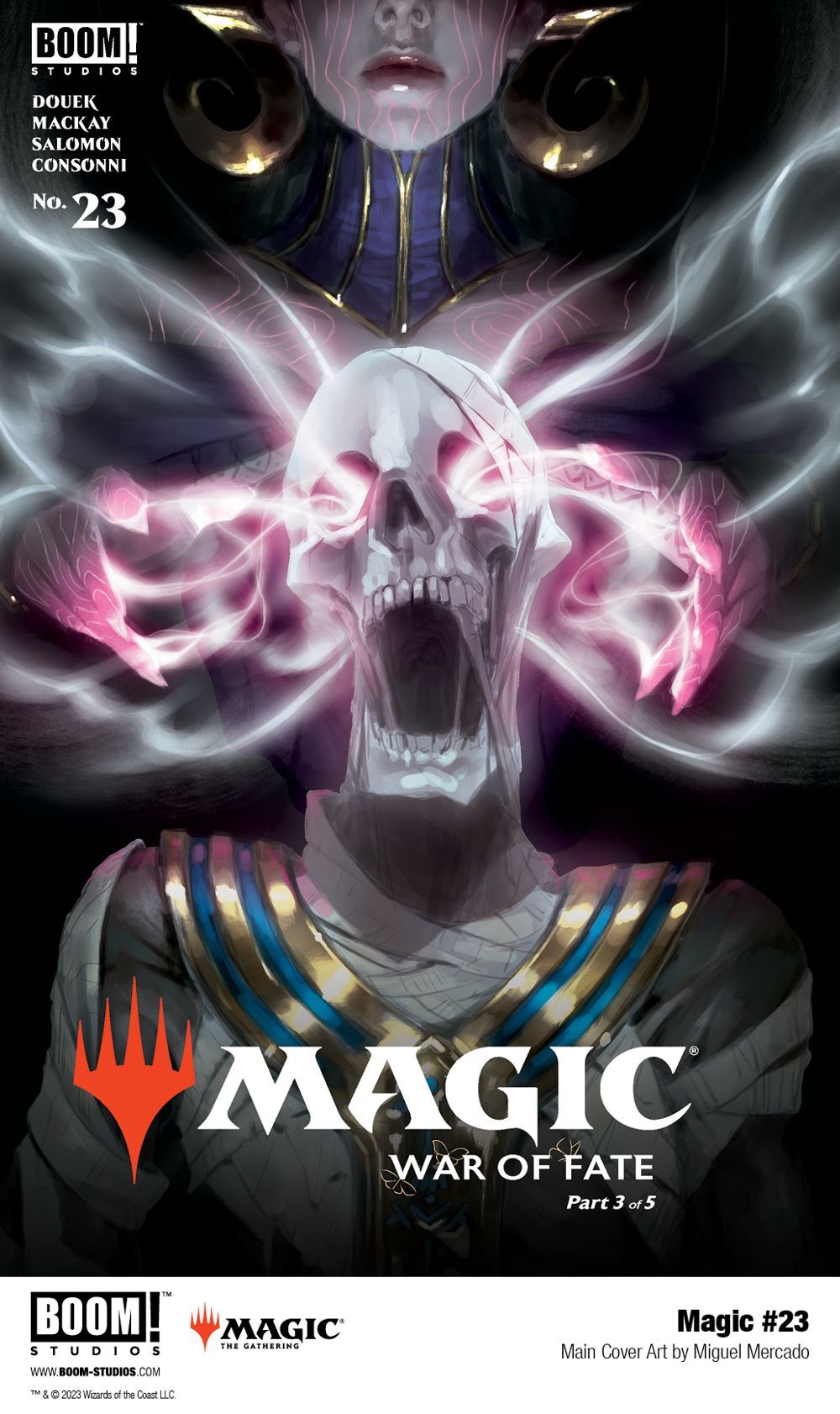 Media Release -- BOOM! Studios, under license by Hasbro, Inc. (NASDAQ: HAS) and in partnership with Wizards of the Coast LLC, announced today a first look at MAGIC #23, the next issue from acclaimed comics writers Jed MacKay (Moon Knight) and Rich Douek (Superman Red & Blue), artist Jacques Salomon (Magic: Master of Metal), colorist Arianna Consonni of Arancia Studio, and letterer Ed Dukeshire, about a series of mysteries plaguing fan-favorite planeswalkers all over the Multiverse, available in February 2023.