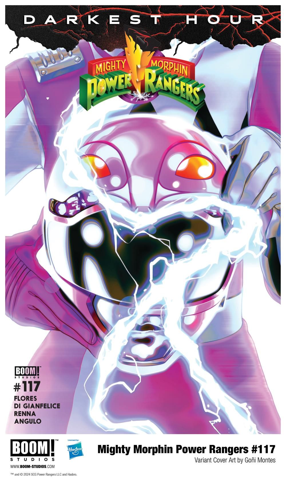 Media Release -- BOOM! Studios, under license by leading toy and game company Hasbro, Inc. (NASDAQ: HAS), revealed a first look at MIGHTY MORPHIN POWER RANGERS #117, the continuation of the DARKEST HOUR event, taking place after the bold and greatly anticipated Reunited, Recharged era of Mighty Morphin Power Rangers. The superstar creative lineup includes writer Melissa Flores (Power Rangers, The Dead Lucky), artist Simona Di Gianfelice (All New Firefly) with Marco Renna (Mighty Morphin), colorist Raúl Angulo (Mech Cadet Yu) with assistance by Jose Enrique Fernández, and letterer Ed Dukeshire (The Woods, Irredeemable) in the continuation of this monumental 12-month event, available in February.