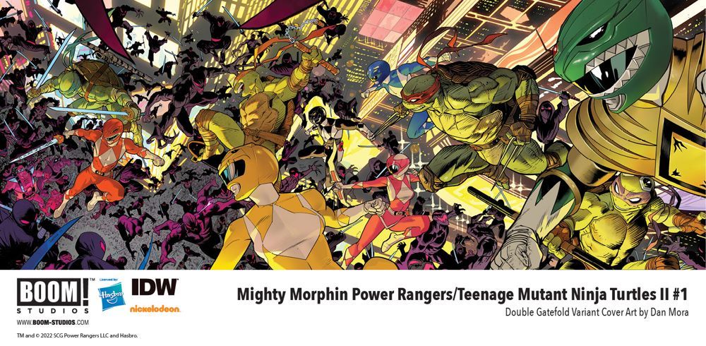 Media Release -- BOOM! Studios, under license by Hasbro, Inc., a global branded entertainment leader, and in partnership with IDW, Nickelodeon, and Paramount Consumer Products, is proud to reveal an exclusive first look at MIGHTY MORPHIN POWER RANGERS/TEENAGE MUTANT NINJA TURTLES II #1, the first issue of the highly anticipated sequel comic book series from acclaimed writer Ryan Parrott (Mighty Morphin Power Rangers, Rogue Sun), fan-favorite artist Dan Mora (World’s Finest, Once & Future), colorist Raúl Angulo, and letterer Ed Dukeshire. The sequel comic book series returns to the world of the hit crossover for an all-new adventure with fan-favorite teen fighting teams in December 2022.