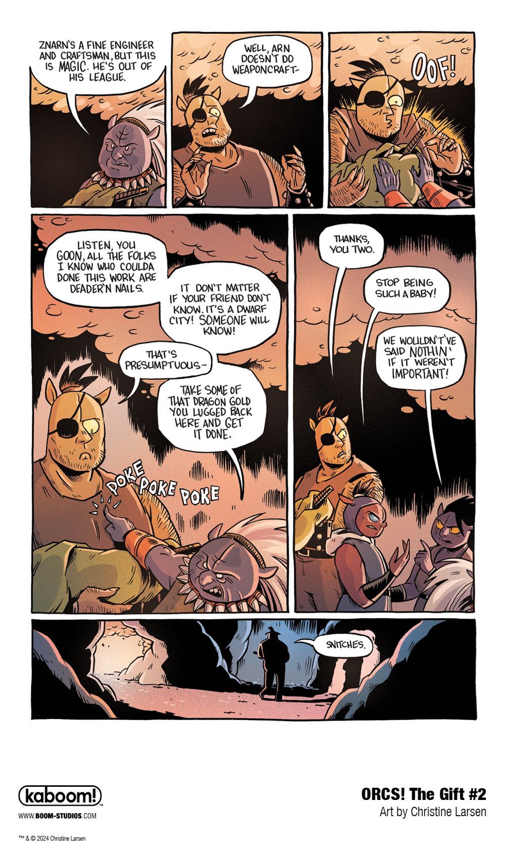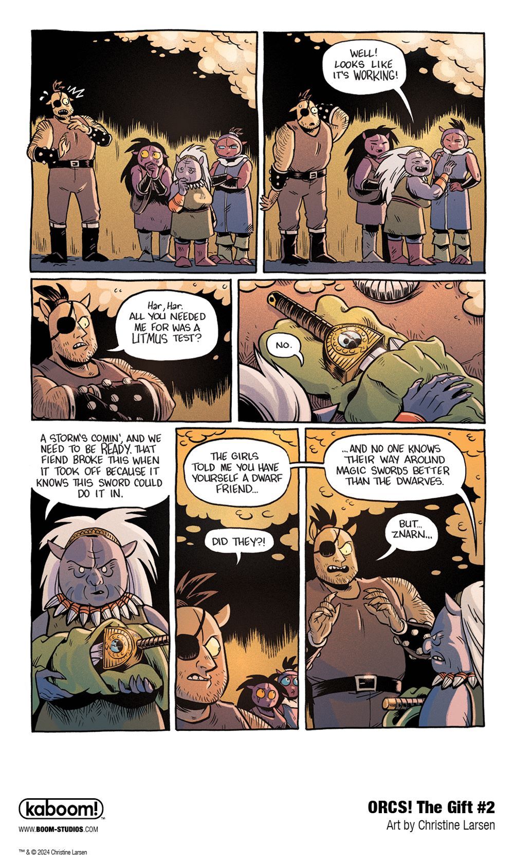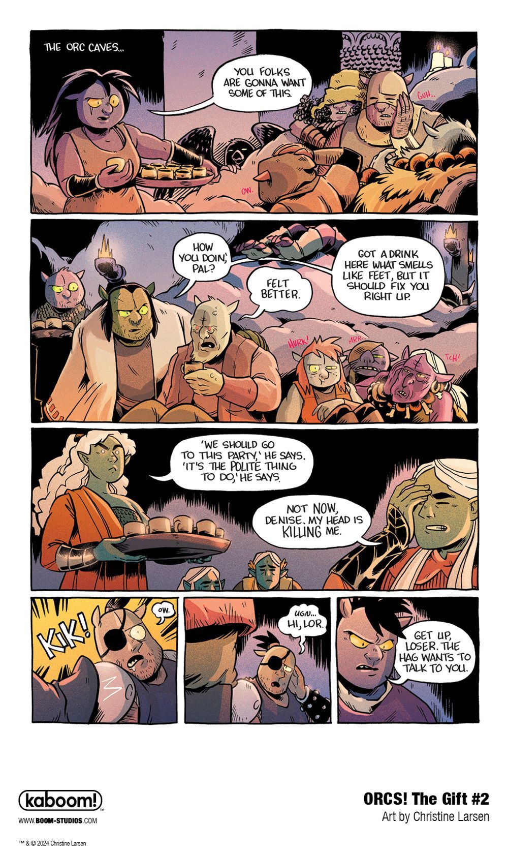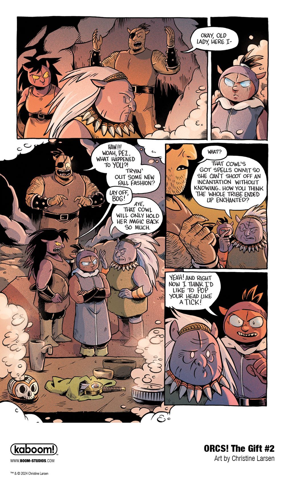 Media Release -- BOOM! Studios today revealed a first look at ORCS!: THE GIFT #2, the next issue of the third and final chapter of the critically acclaimed comic book series by cartoonist Christine Larsen (Adventure Time, By Night), in the world of the beloved misfit ORCS! in January 2024.