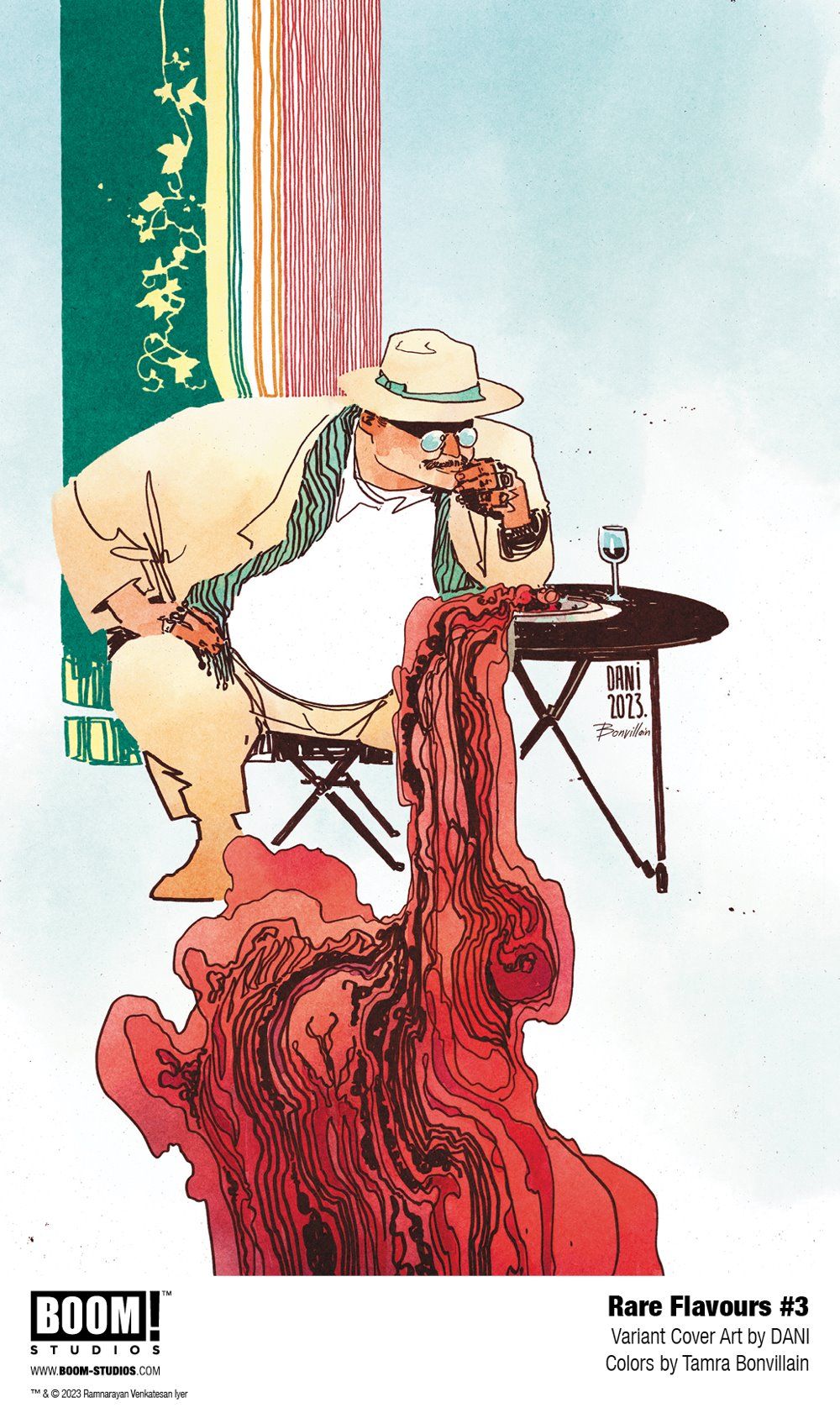 Media Release -- BOOM! Studios today revealed a first look at RARE FLAVOURS #3, the third issue of the brand new series from the Eisner, Harvey, and Ringo Award-nominated team behind the critically acclaimed series The Many Deaths of Laila Starr, writer Ram V (Detective Comics, These Savage Shores), artist Filipe Andrade (Captain Marvel), and letterer AndWorld Design, in this painstakingly prepared series for fans of food, art, and the celebration of life, available this December.