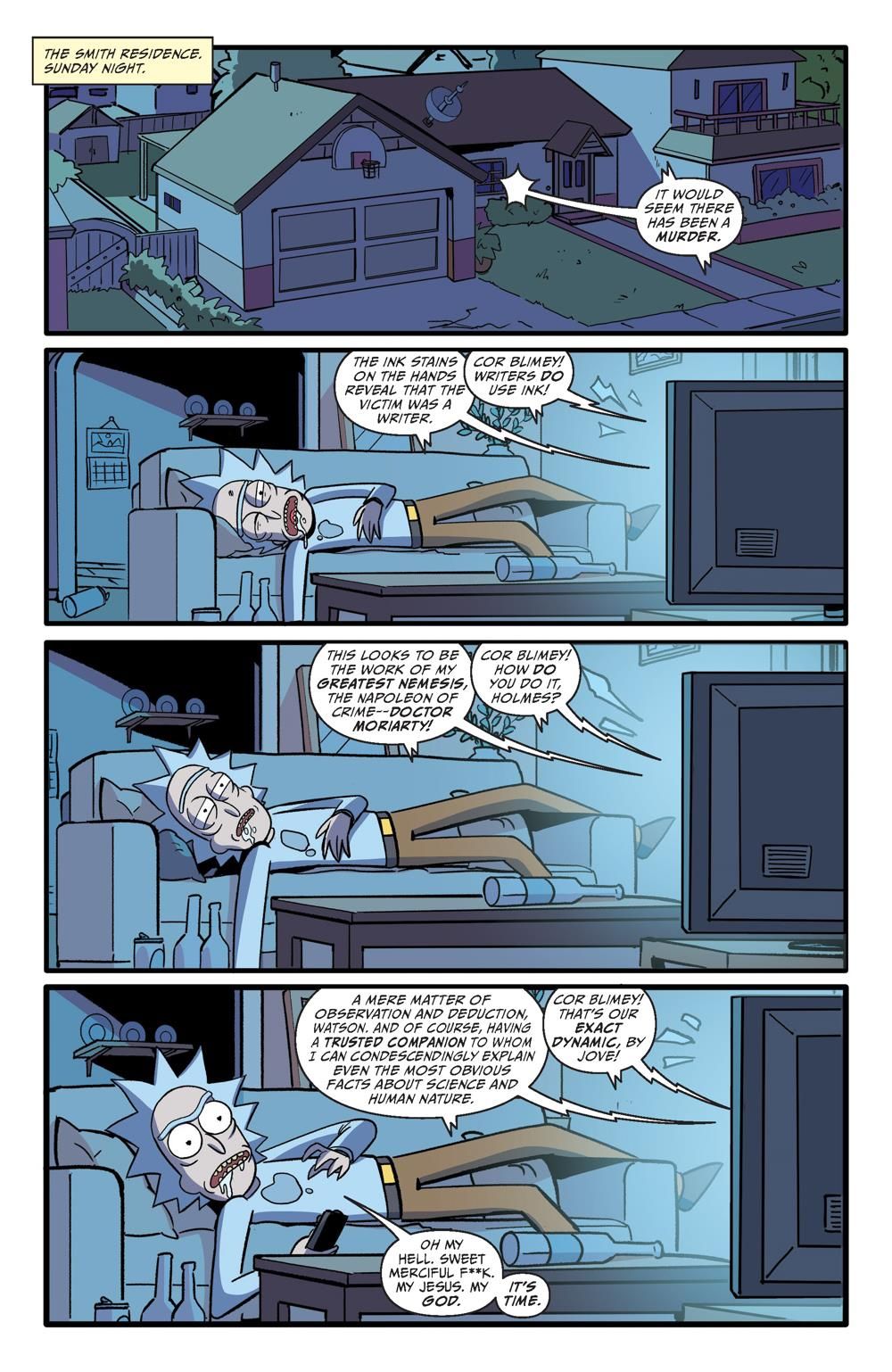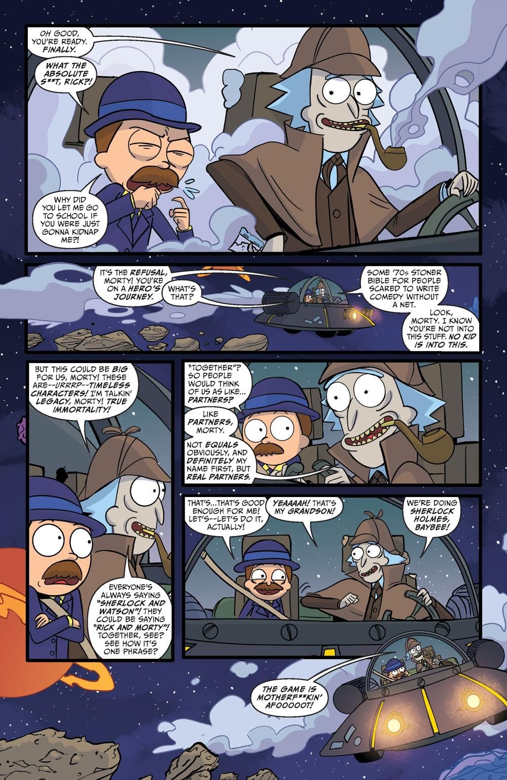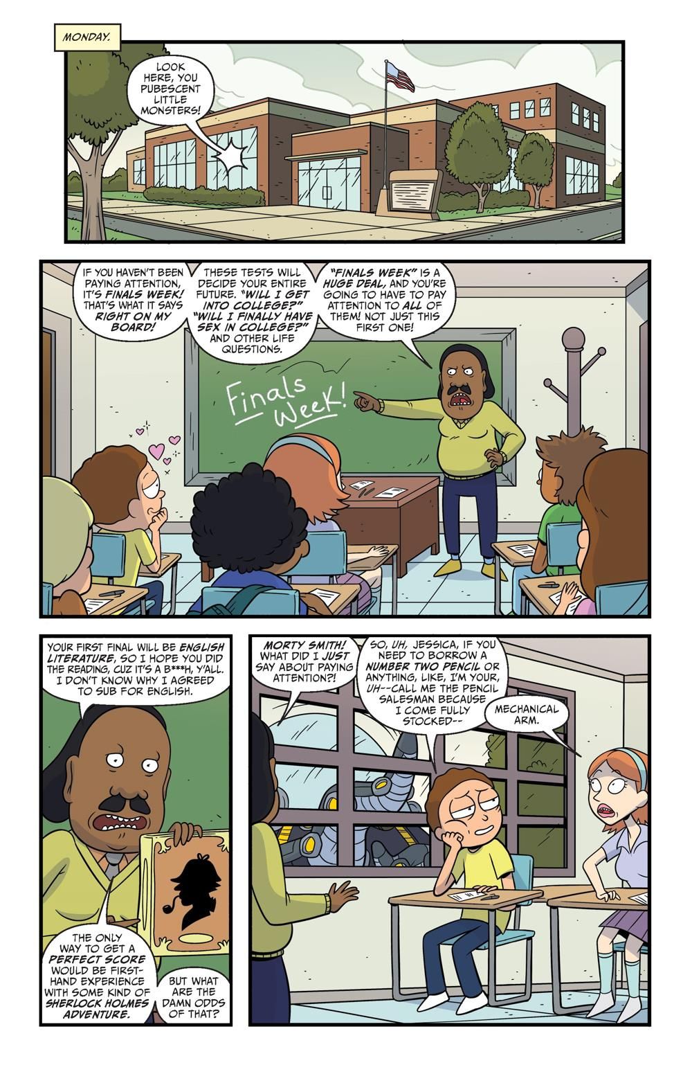 The worst week of Morty's life starts right . . . NOW! It's Monday, and Finals Week is off to a terrible start. Morty needs a little time off from adventuring in order to study . . . until Rick announces it's time for them to team up like that other great literary duo: Sherlock Holmes and Watson. Transported to a locked-room murder mystery in space, Morty suspects Rick isn't looking to spend time with his Watson, but rather find his own Moriarty . . .
