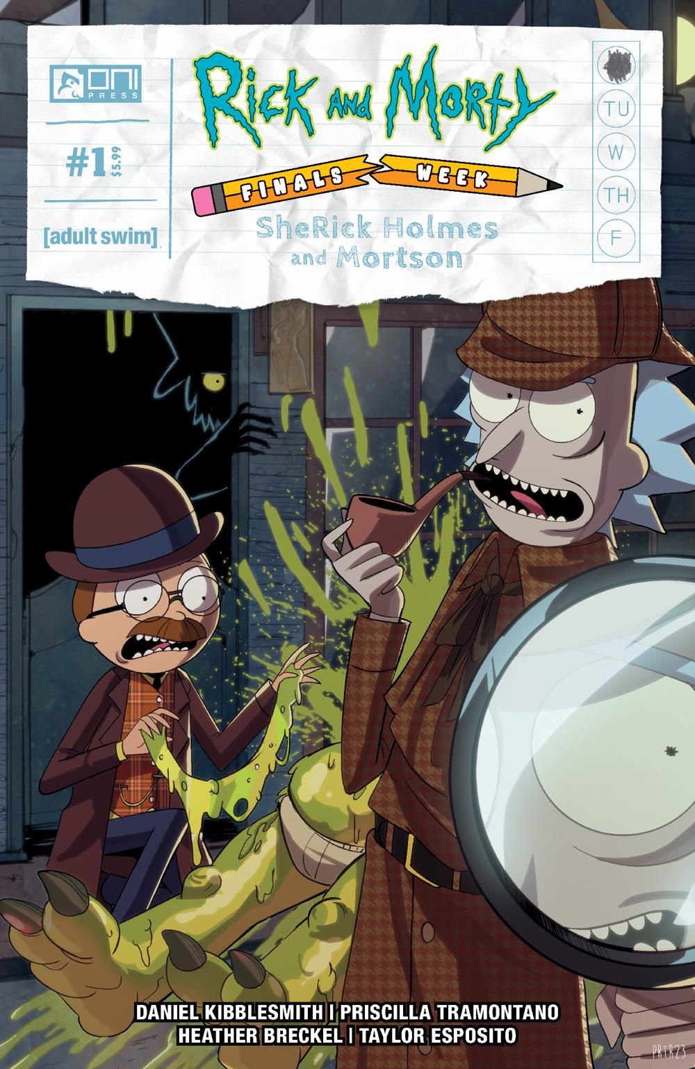 Media Release -- You're not ready! We're not ready! The Rick and Morty omniverse better get ready for RICK AND MORTY: FINALS WEEK. The double-sized, 40-page opening salvo, RICK AND MORTY: FINALS WEEK – SHERICK HOLMES AND MORTSON #1, from multiple Emmy Award-nominated writer nominee Daniel Kibblesmith (Loki) and artist Priscilla Tramontano (Transformers) – is the first shot in a universe-colliding escapade spanning (almost) all of 2024 Get ready for the first of FIVE interconnected and oversized one-shots released bi-monthly from a rotating lineup of cosmic superstars including fan-favorite Rick and Morty alums, brand-new talents, and enough curveballs to keep linear space-time from ever returning to the same fixed point. (Because: science!)