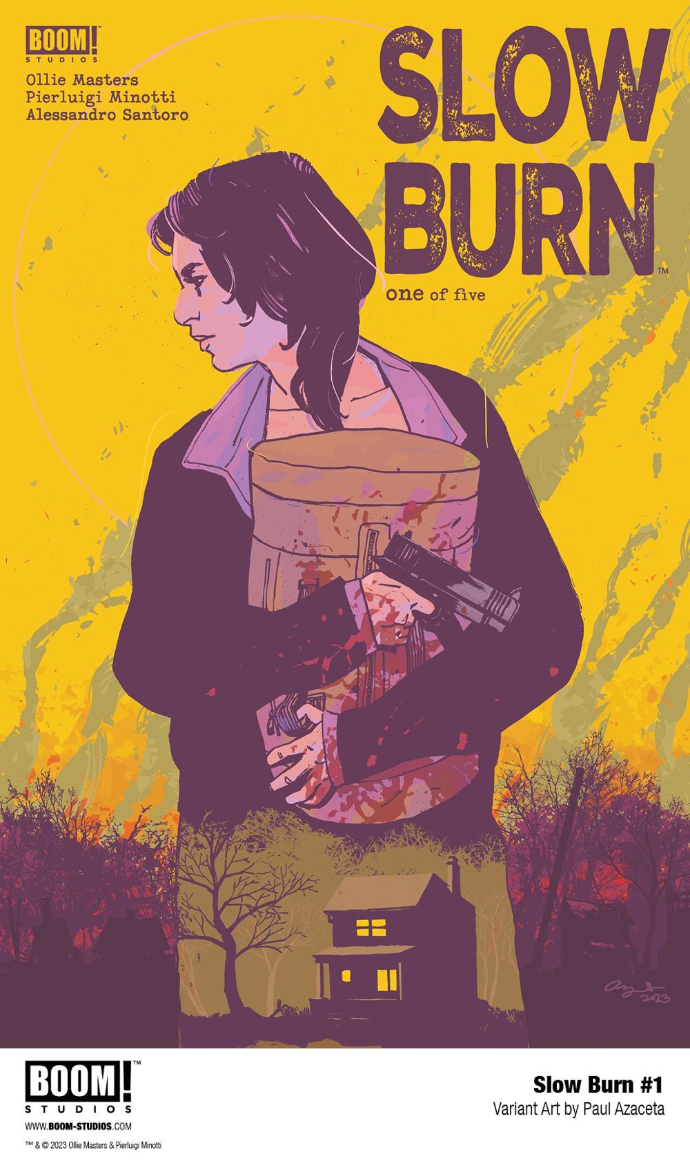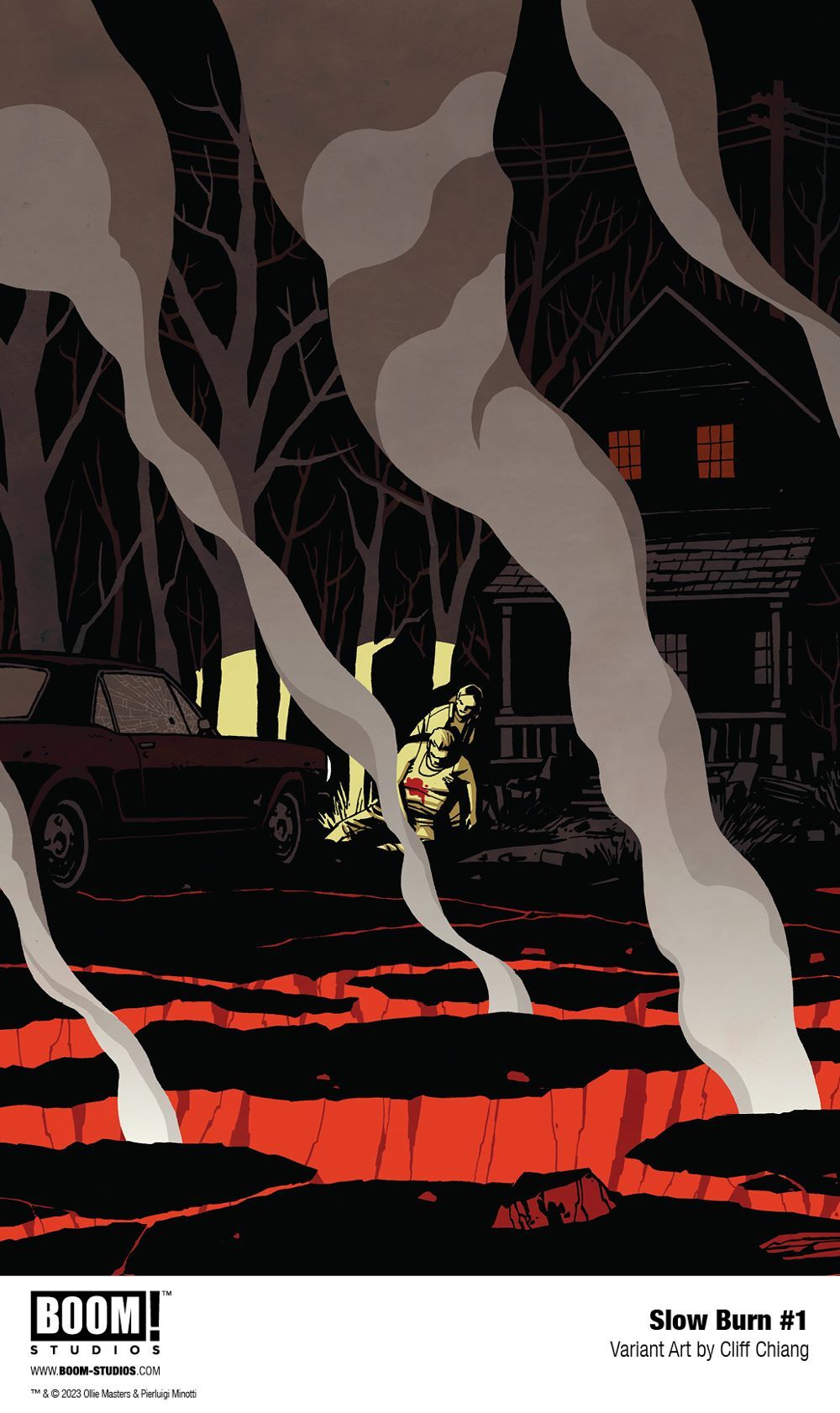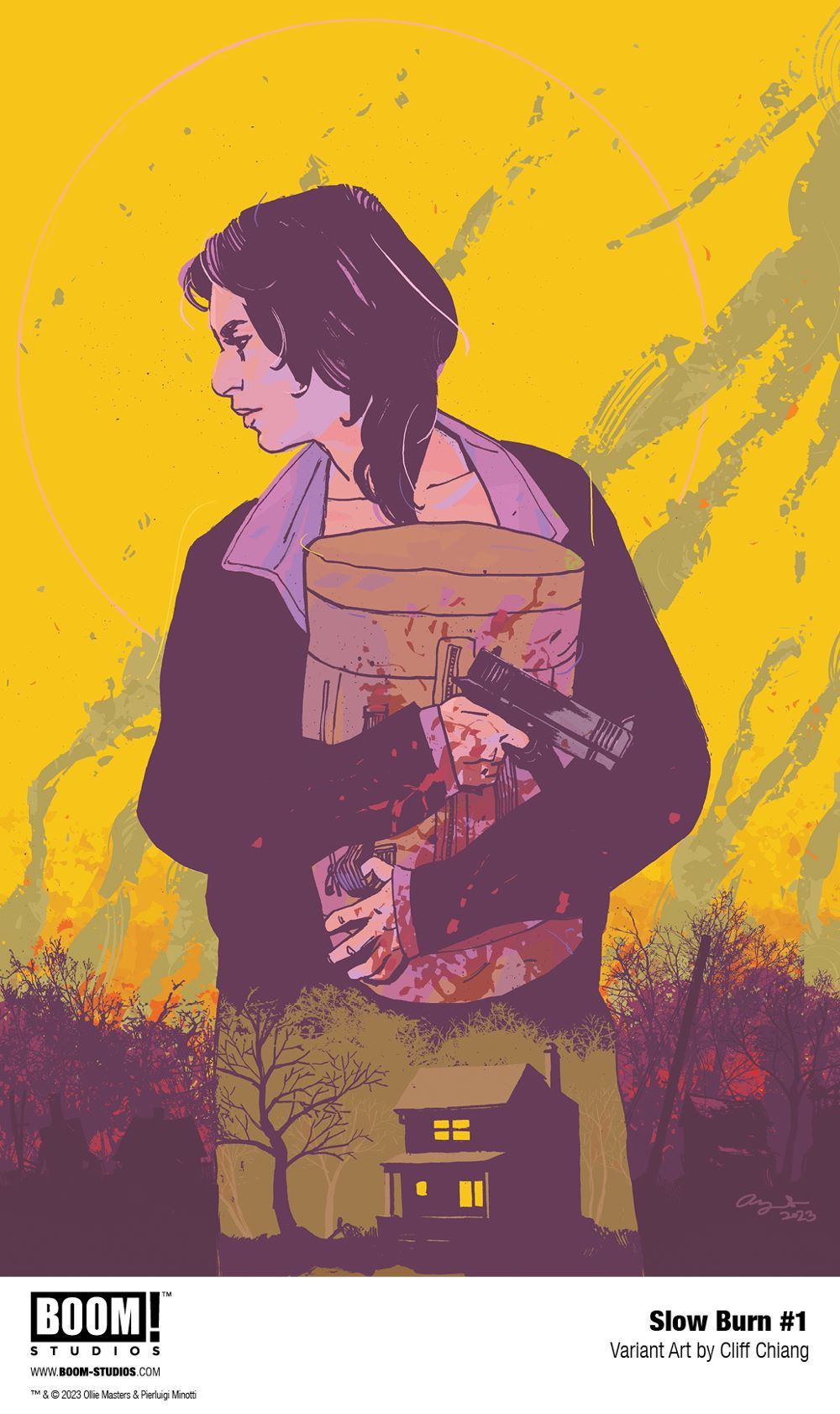 SLOW BURN #1 is the newest release from BOOM! Studios' eponymous imprint, home to critically acclaimed original series, including BRZRKR by Keanu Reeves, Matt Kindt, and Ron Garney; Something is Killing the Children by James Tynion IV and Werther Dell'Edera; Once & Future by Kieron Gillen and Dan Mora; Wynd by James Tynion IV and Michael Dialynas; Grim by Stephanie Phillips and Flaviano; Briar by Christopher Cantwell and Germán García; Stuff of Nightmares by R.L. Stine and A.L. Kaplan; The Approach by Jeremy Haun, Jason A. Hurley, and Jesus Hervas; Damn Them All by Simon Spurrier and Charlie Adlard; Behold, Behemoth by Tate Brombal and Nick Robles; Once Upon a Time at the End of the World by Jason Aaron, Alexandre Tefenkgi, Leila del Duca, and Nick Dragotta; Know Your Station by Sarah Gailey and Liana Kangas; A Vicious Circle by Mattson Tomlin and Lee Bermejo; Mosely by Rob Guillory and Sam Lotfi; Harrower by Justin Jordan and Brahm Revel; The Neighbors by Jude Ellison S. Doyle and Letizia Cadonici; The Seasons Have Teeth by Dan Watters and Sebastián Cabrol; Ghostlore by Cullen Bunn and Leomacs; and Sirens of the City by Joanne Starer and Khary Randolph. The imprint also publishes popular licensed properties, including Dune: House Harkonnen from Brian Herbert, Kevin J. Anderson, and Michael Shelfer; Mighty Morphin Power Rangers from Melissa Flores and Simona Di Gianfelice; Magic from Jed McKay, Rich Douek, and Ig Guara; and The Expanse: Dragon Tooth by Andy Diggle and Rubine.