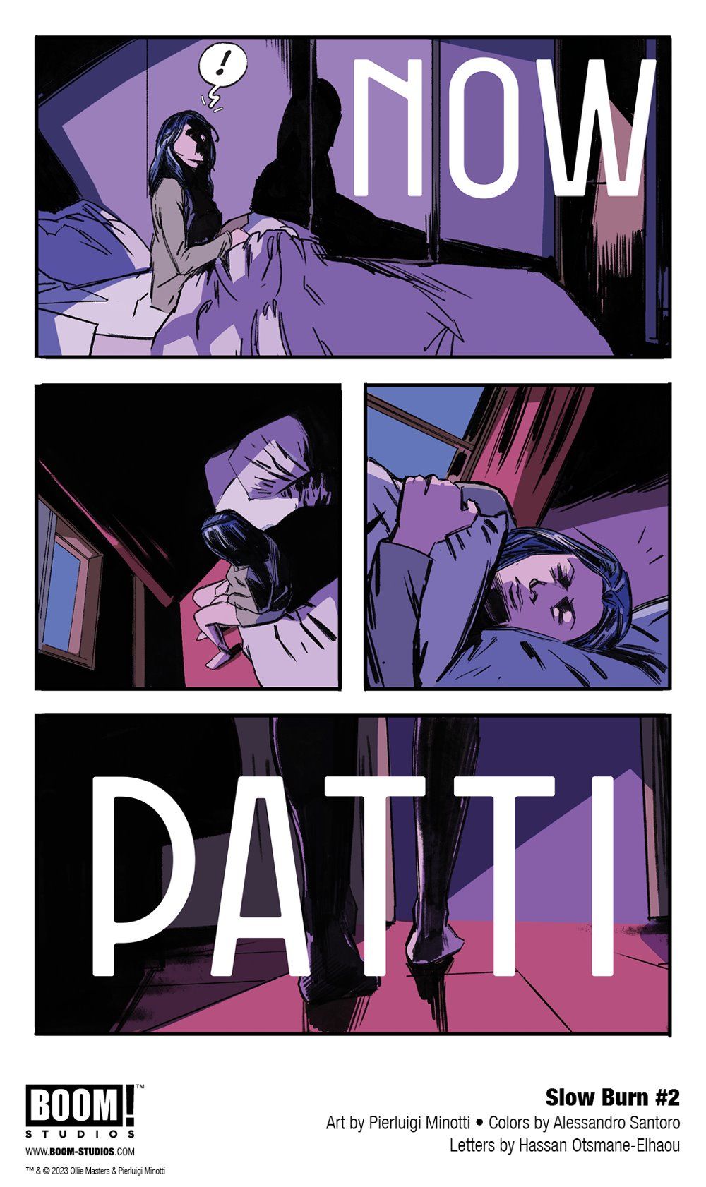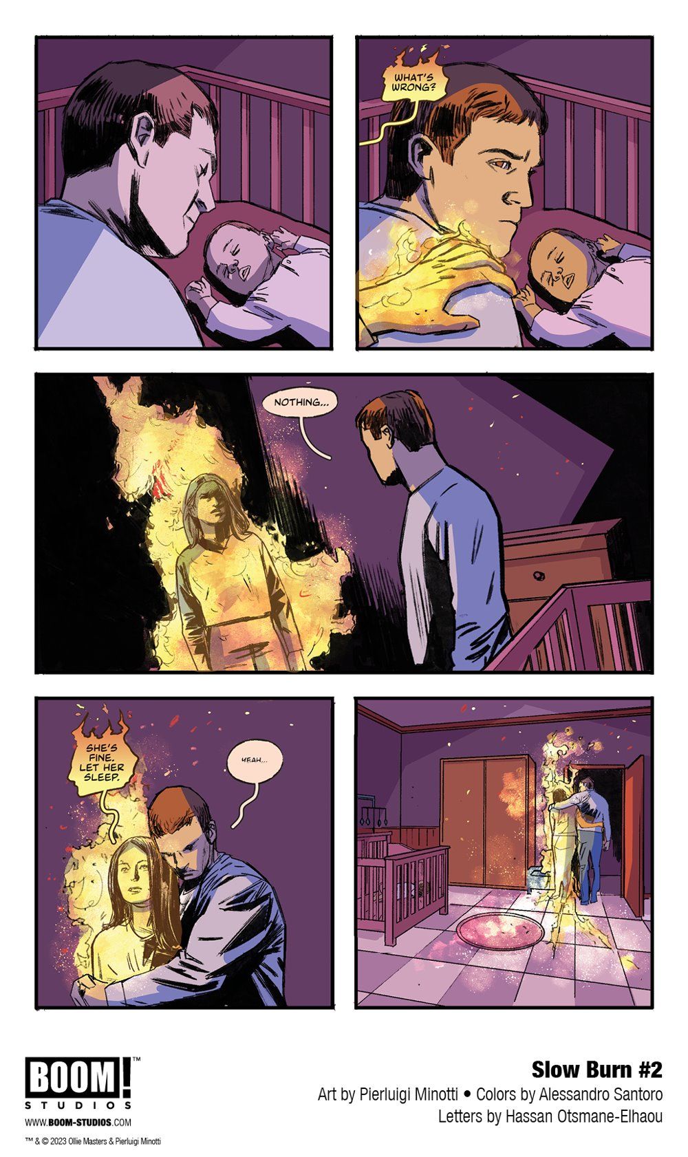 Media Release -- BOOM! Studios today revealed a first look at SLOW BURN #2, the first issue of the brand new series from acclaimed noir crime writer Ollie Masters (Snow Blind), rising star artist Pierluigi Minotti (Lost Falls), colorist Alessandro Santoro, and letterer Hassan Otsmane-Elhaou, a tale about dirty deeds in a town on fire, available November 2023.