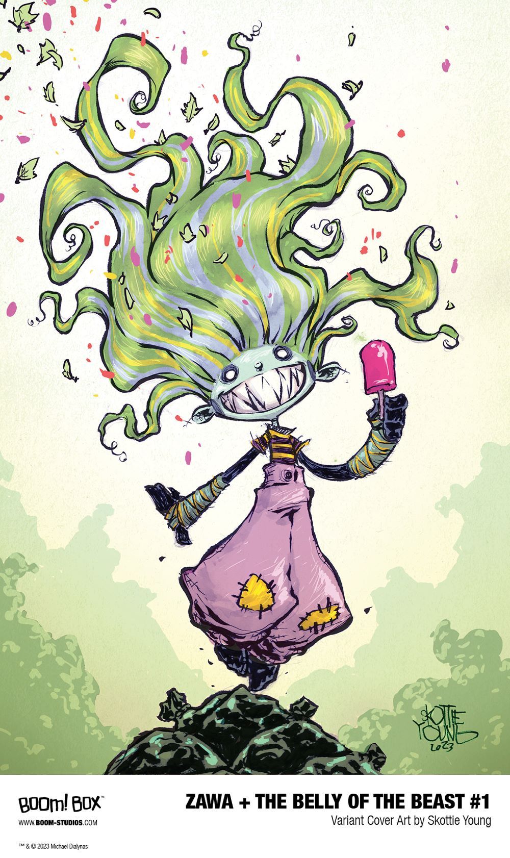 Media Release -- BOOM! Studios today revealed a first look at ZAWA + THE BELLY OF THE BEAST #1, the premier issue of the brand new series from GLAAD Award-winning and Eisner Award-nominated cartoonist Micahel Dialynas (Wynd, Teenage Mutant Ninja Turtles). ZAWA + THE BELLY OF THE BEAST is a charmingly macabre eco-friendly fable about nature, greed, and good food shared with better friends, available November 2023.