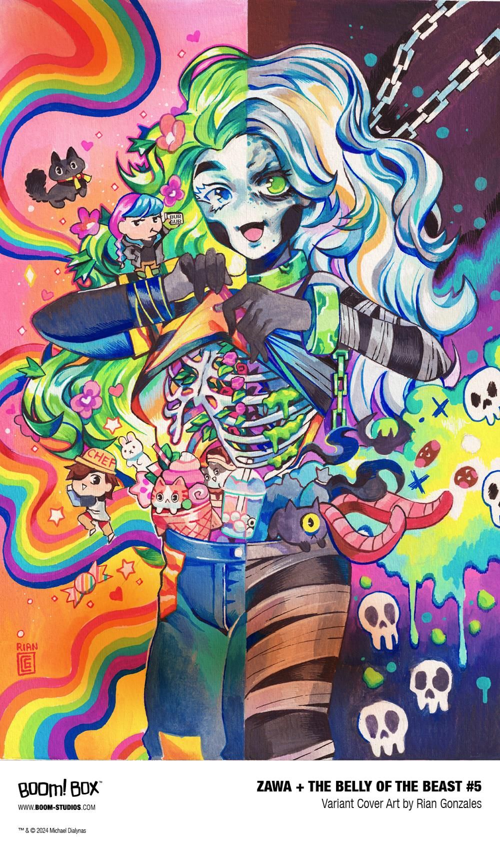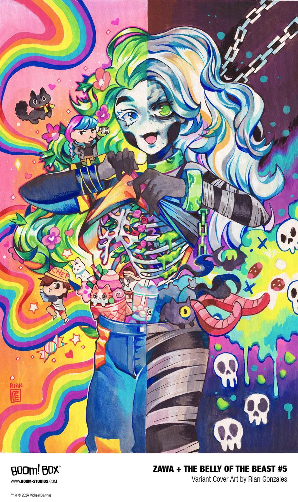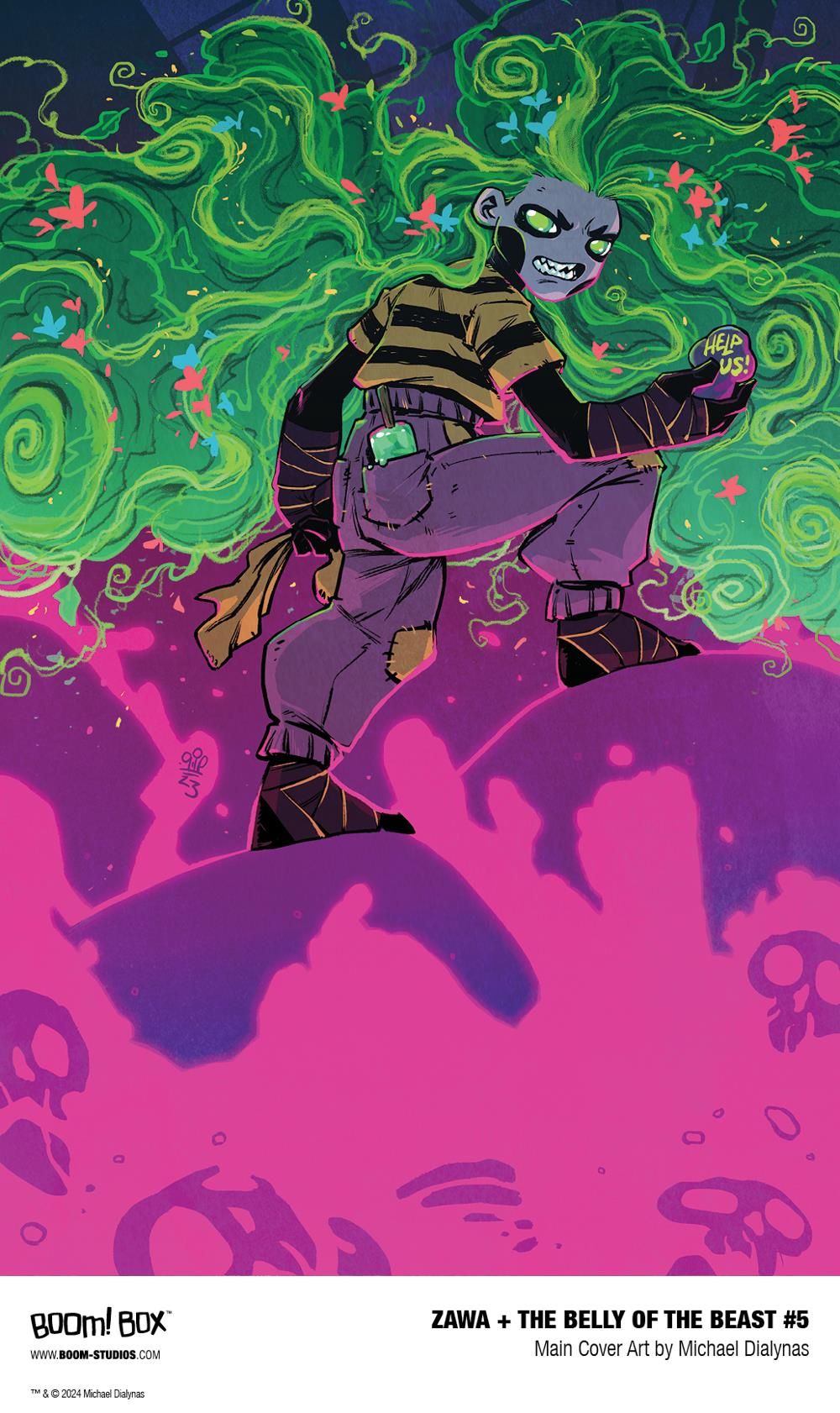 ZAWA + THE BELLY OF THE BEAST #5 features a main cover by Michael Dialynas with variants by fan-favorite artists Rian Gonzales (Batgirls), Toni Infante (Mighty Morphin Power Rangers), and Logan Faerber (Harley Quinn).