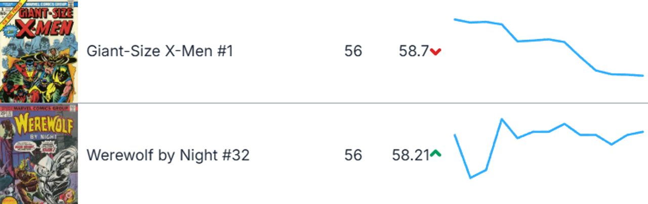 As the back issue comic book market continues to fluctuate as it has over the past few years, other issues may fall or rise in our Bronze Age CPI. One to watch carefully in the coming weeks and months is Werewolf by Night #32, the first appearance of Moon Knight. Its price has stabilized somewhat over the past couple months, as can be seen in the three-month trend lines above, while Giant-Size X-Men #1 continues to drop. At this point, the two are only separated in the index by 0.49 points. A lower census count (6,222) and stabilizing demand mean Werewolf by Night #32 may have reached post-boom bottom and could overtake Giant-Size X-Men #1 for the third spot in our Bronze Age CPI.