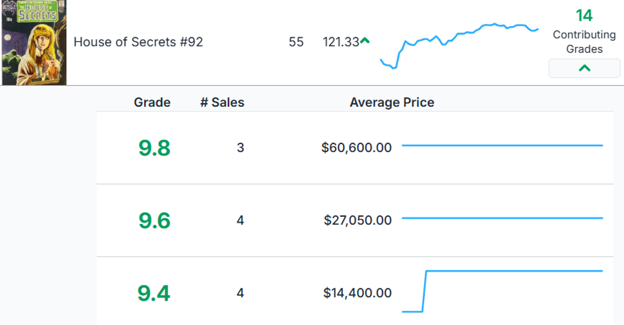 In the case of House of Secrets #92, however, there have been no sales in the 9.8 or 9.6 grades and just one sale in the 9.4 grade that raised the average value from $13,575 to its present $14,400 valuation. In grades below 9.4, there has been some slight change in value in either direction – more grades upward than downward – with a few that have stayed relatively flat. Keep in mind, however, that the overall index value for Swamp Thing’s first appearance has only risen 1.7% since hitting its low point in November of last year.
