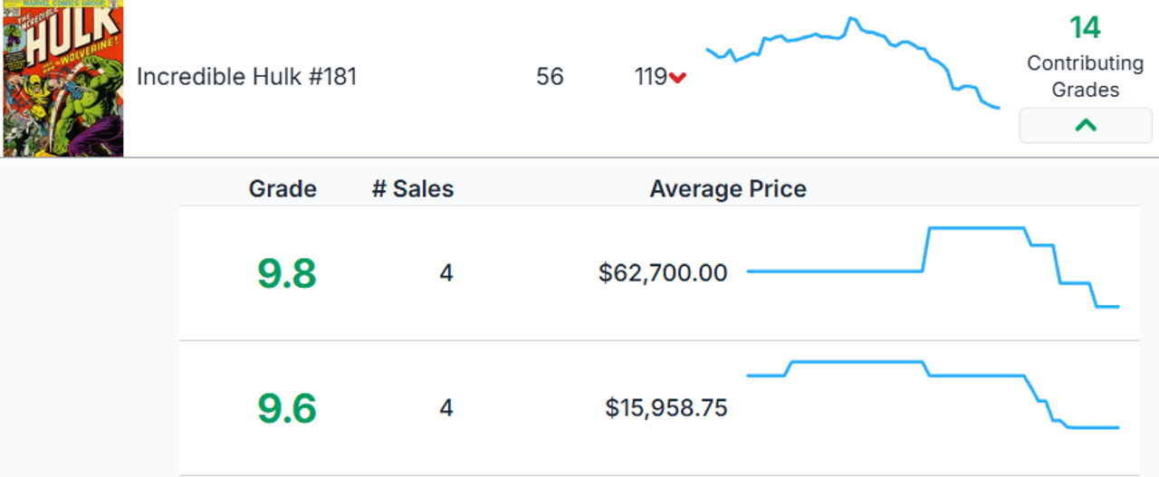 This appears to be less a case of skyrocketing value for House of Secrets #92 and more one of plummeting value for Incredible Hulk #181. Digging a little deeper, most of the damage to Wolverine’s first appearance is due to sales in the high grades. At its peak on April 6, the average 9.8 value in our index was $69,555. It has since dropped to $62,700, and the most recent sale in the September 13 Heritage auction was for $54,000. In the 9.6 grade, value in the index has dropped from $18,222.50 to $15,978.50.