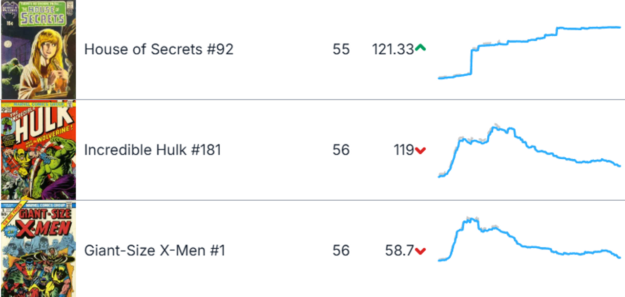 Incredible Hulk #181 hit its overall Bronze Age CPI peak on May 1, 2022 with an index value of 202.9. On that same date, House of Secrets #92 had an index value of 92.6. That would have only placed it third on our index at that time, with Giant-Size X-Men #1, owning a then index value of 126.95. As you can see from the above chart, the downward trends for Giant-Size X-Men #1 and Incredible Hulk #181 look eerily similar. So, why are two Bronze Age keys dropping so much in value while another is rising, albeit marginally? The simple answer comes down to supply and demand.