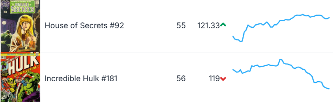 As you can see, House of Secrets #92 has a current index value of 121.33 besting the index value of 119 for Incredible Hulk #181. Looking at the past year, Wolverine’s first appearance peaked on April 6 with an index value of 134.1 and it’s been nosediving since. Swamp Thing’s first appearance, on the other hand, hit a low in the index of 119.3 on November 10, 2024. It has been a slow and steady – if unspectacular – climb since.