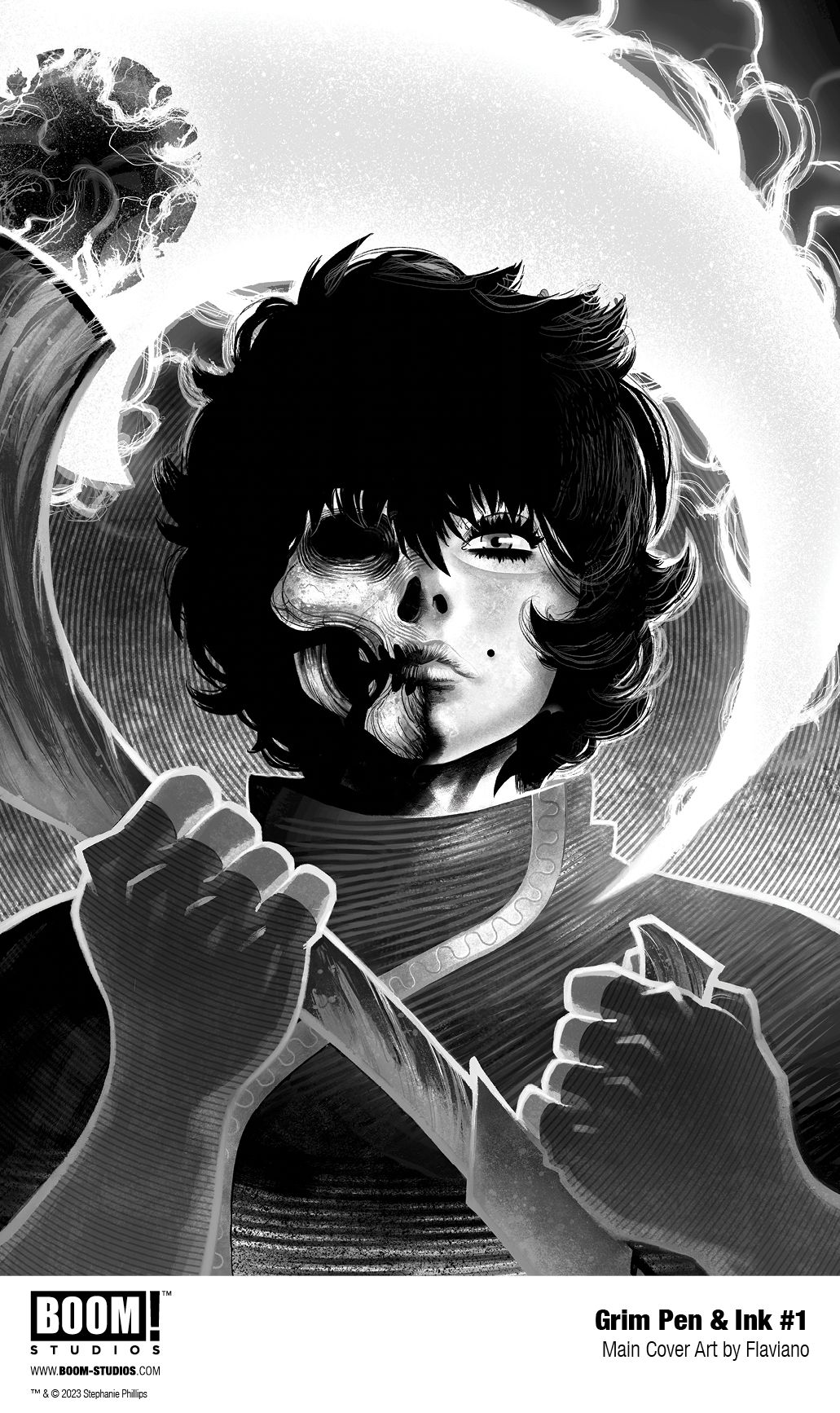 Media Release -- BOOM! Studios announced today the continuation of the PEN & INK collection: a deluxe art-focused format of select first issues, featuring stunning black and white interior artwork and cover alongside artist commentary. This latest installment will spotlight the first issue of the breakout series GRIM #1 by Stephanie Phillips and Flaviano, available February 2024.