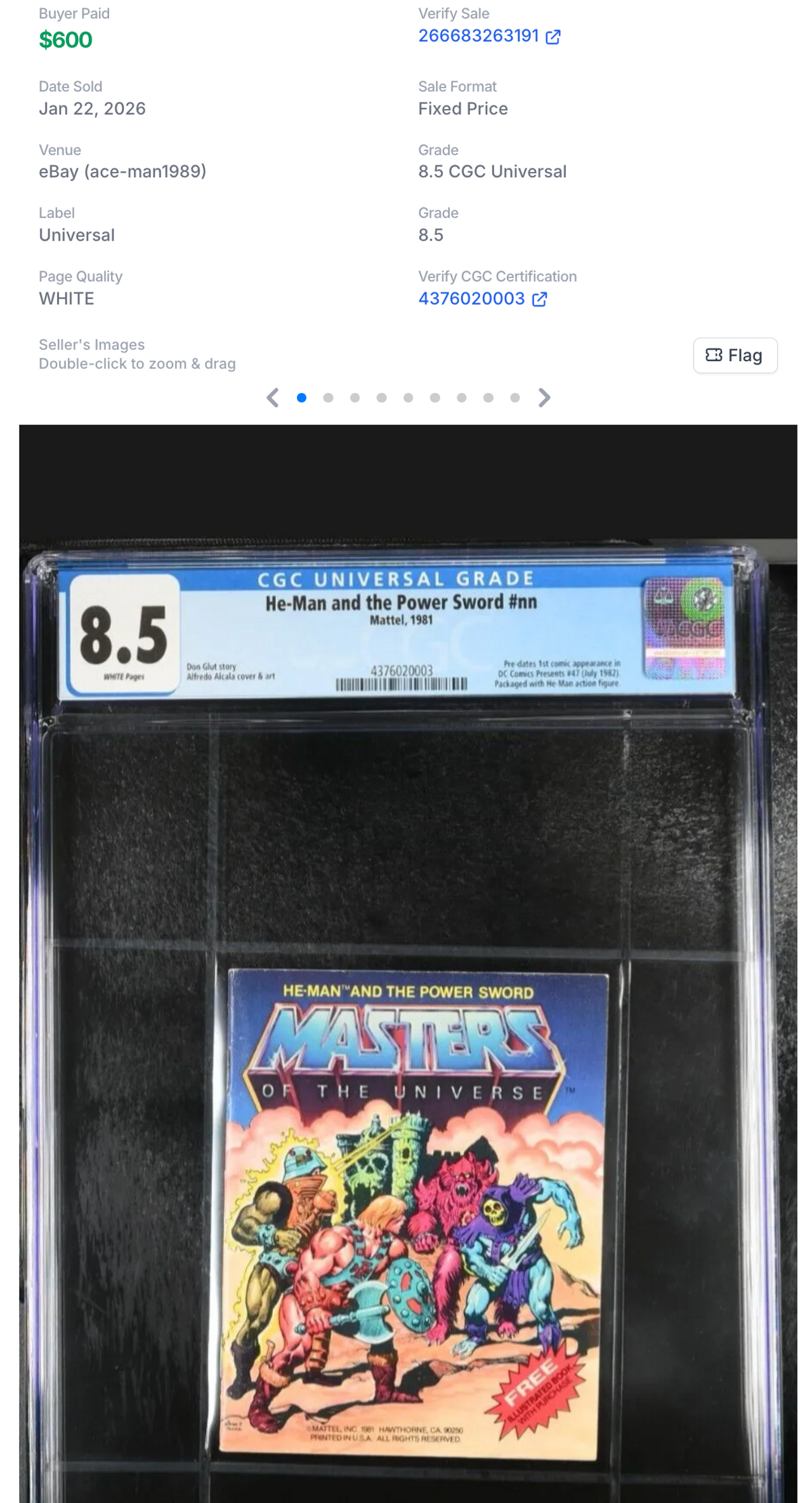 We also saw a big sale for a CGC 8.5 copy of He-Man and the Power Sword, a mini-comic book that was included in the packages for the original Masters of the Universe toys in December 1981, and predates DC Comics Presents #47. Graded copies of this book are extremely rare; there are only 37 Universal blue label copies of this issue on the CGC Census (that is, however, nearly a 50% leap in blue labels since March 2025 when there were only 26 Universal blue labels). This 8.5 copy sold for an impressive $600: