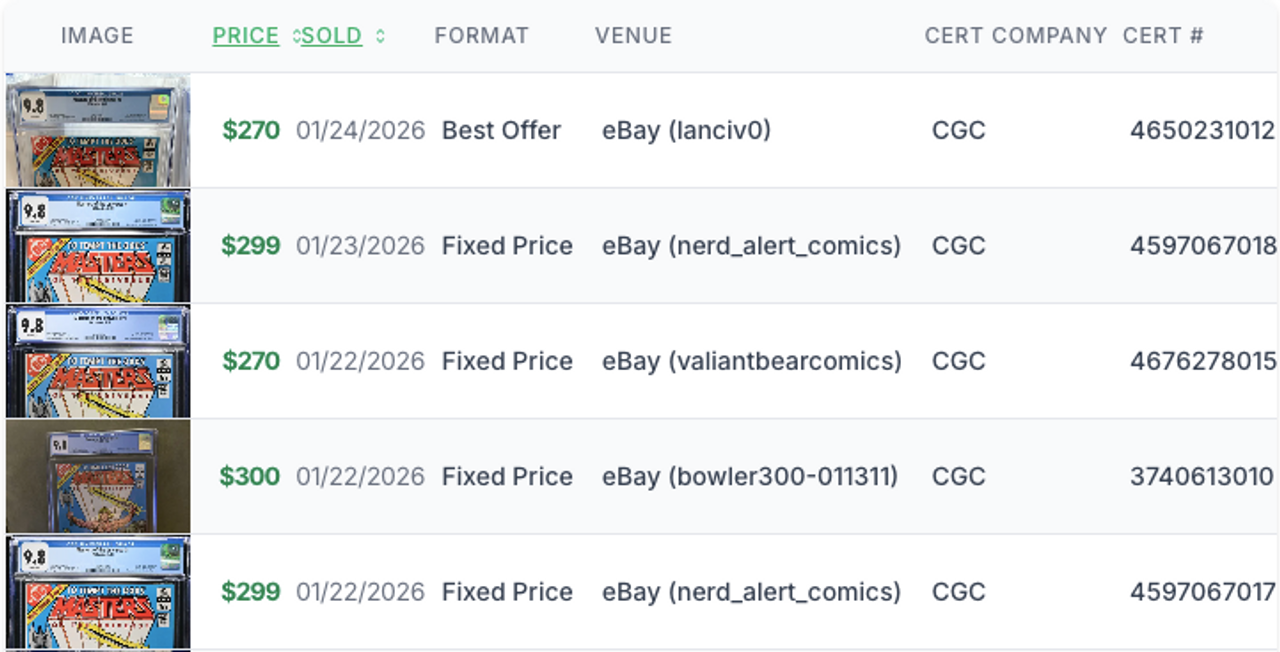 In fact, when I wrote about the He-Man film nearly a year ago in March 2025 after news about the film's cast had been released, I wrote that the "30- and 90-day averages of $1,875 for a CGC 9.8 are about 50% higher than the 1-year average of $1,269." That bounce didn't last long with values dropping lower than the 1-year not long after. In fact, the most recent sale of a 9.8 was only $1,150 on January 22:
