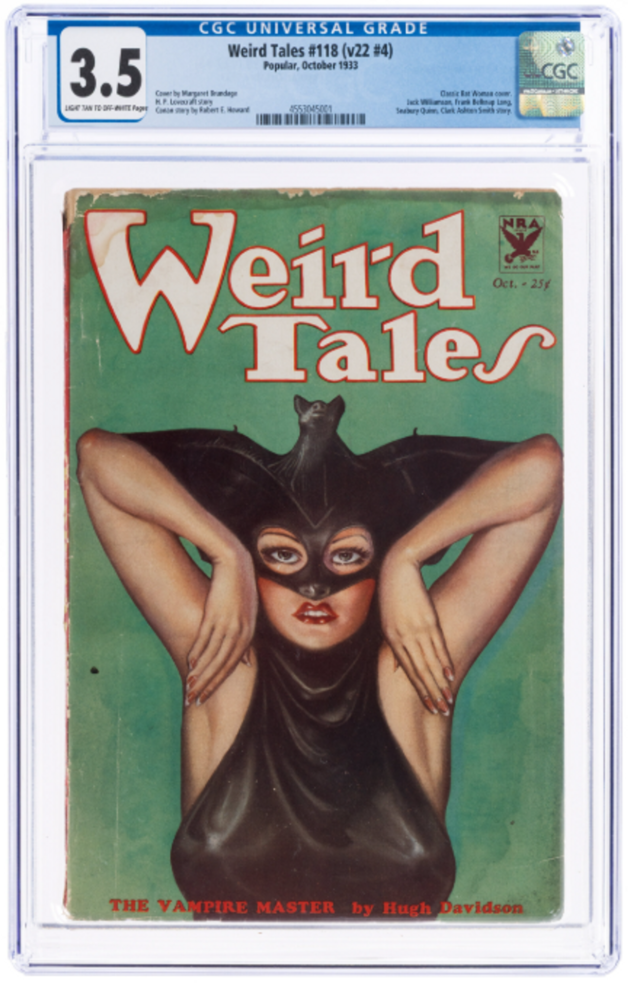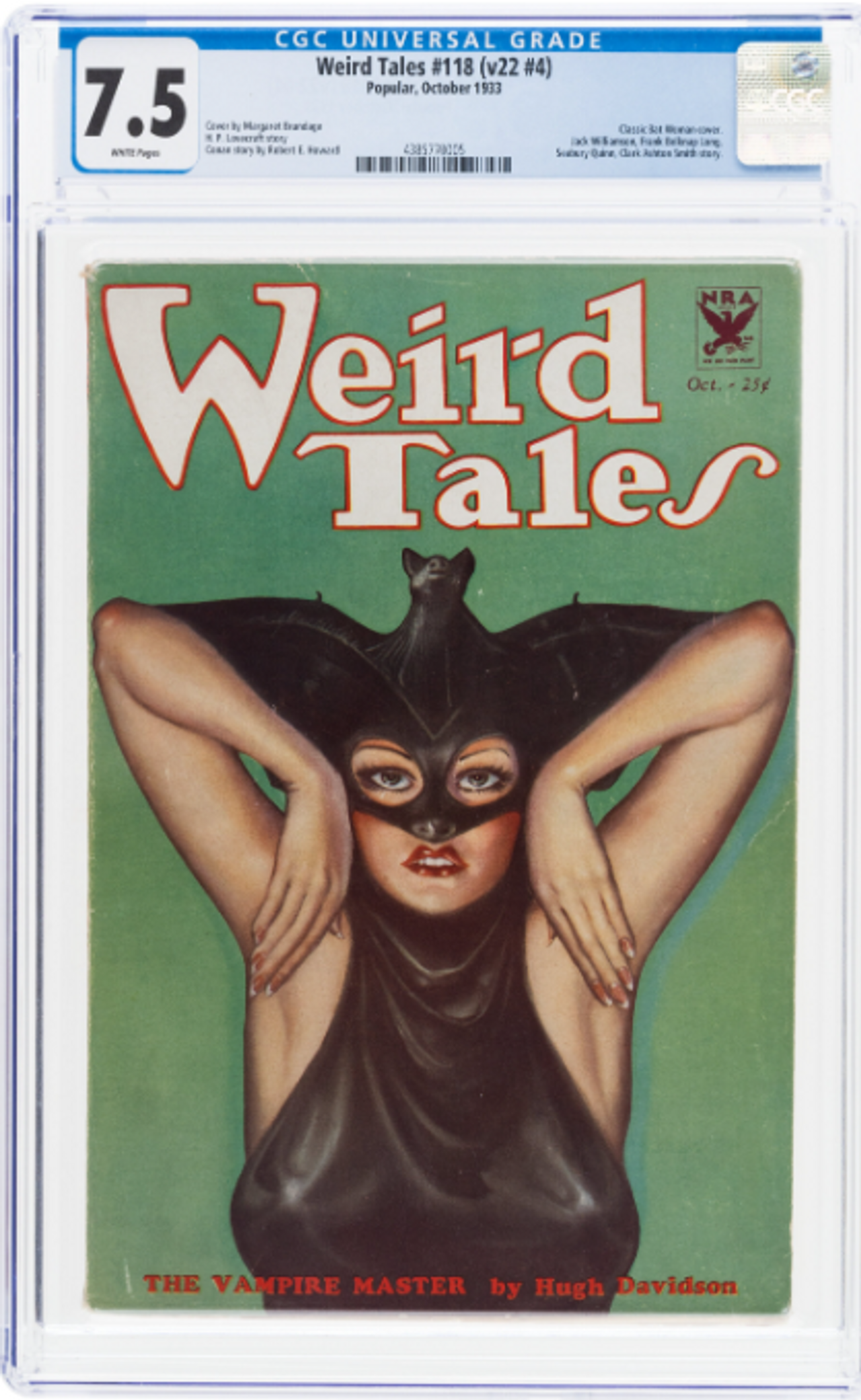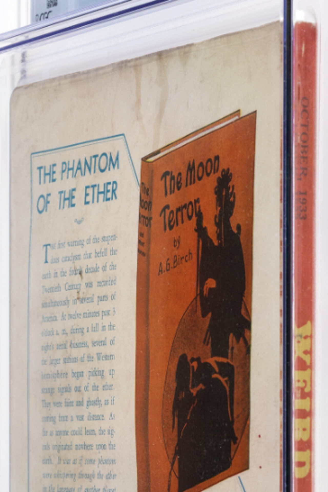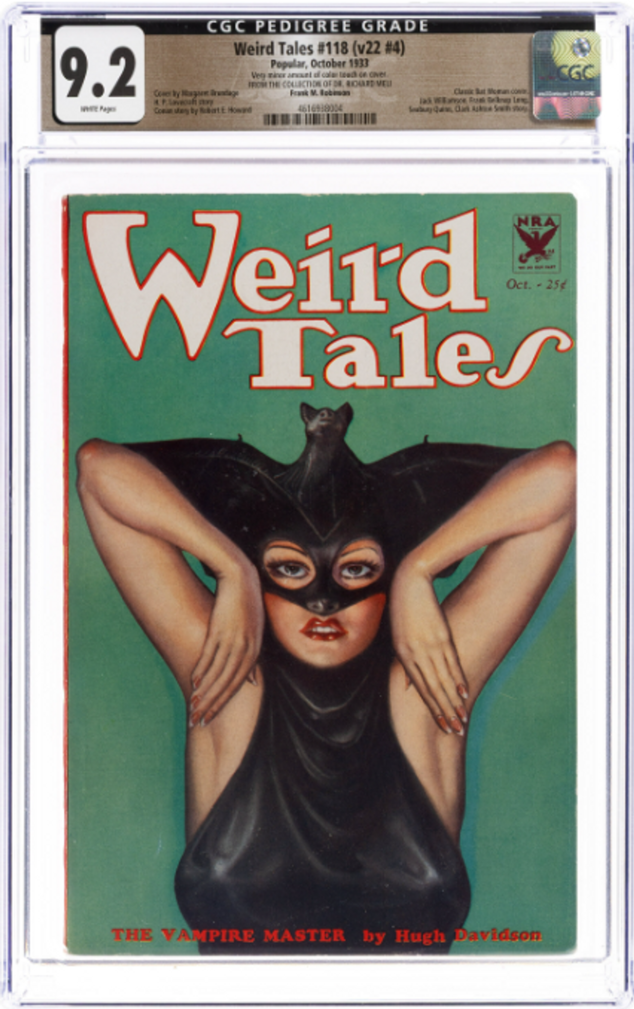 One of the most popular collectible pulp issues since CGC began grading has proven to be Weird Tales #118 (v22 #4). It has a high CGC population count across multiple grades along with accompanying high-resolution sales images. The solid green cover offers a superb backdrop for flaws, and will serve as a fine example of the deterioration of a pulp as you move down in grade.