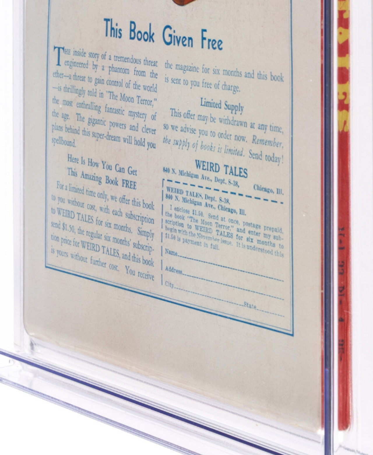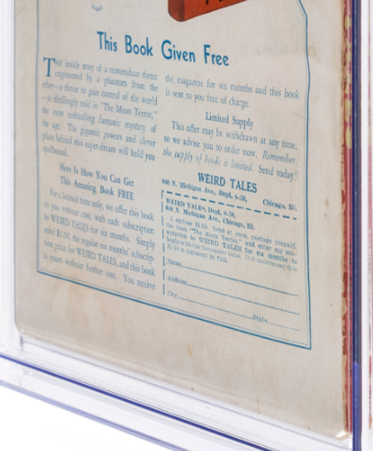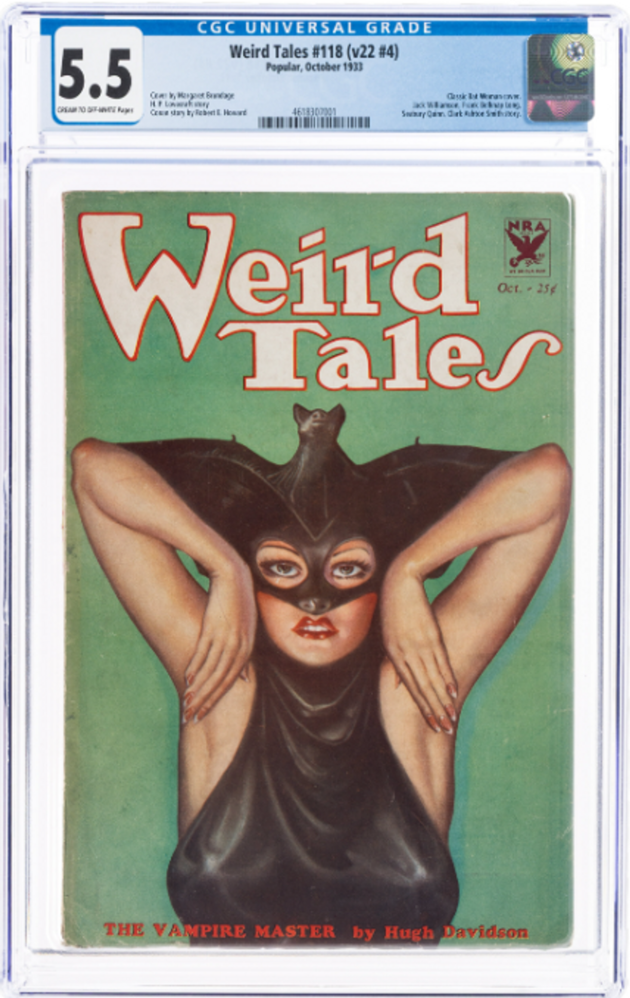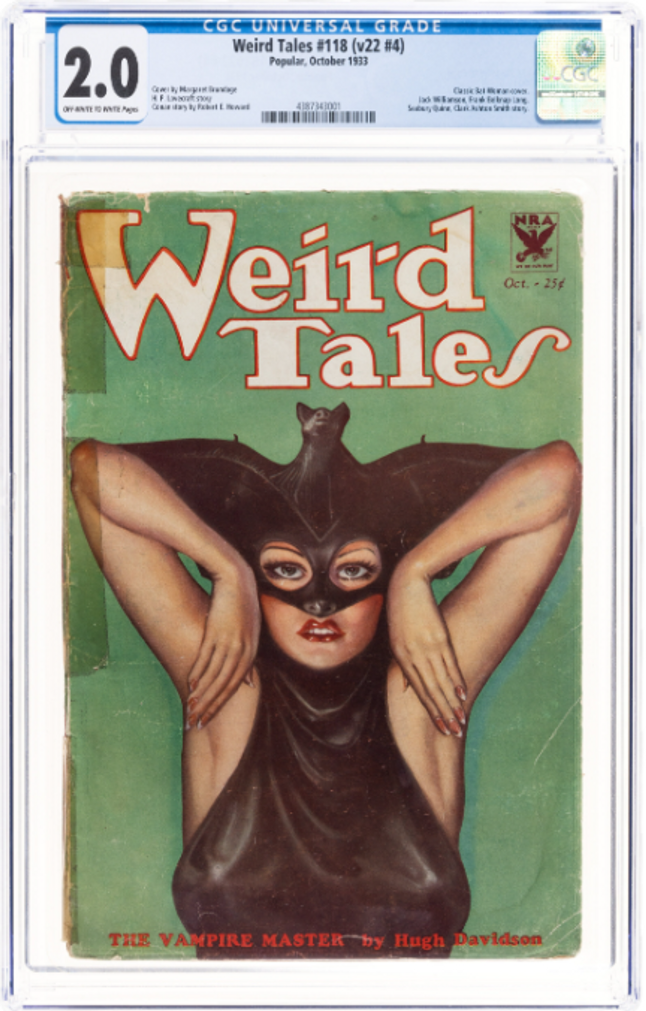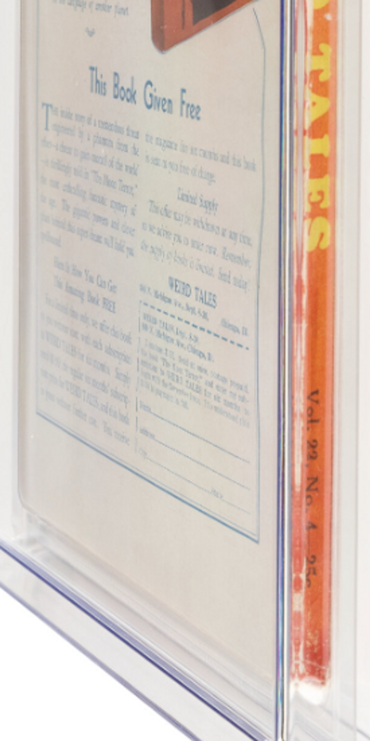 One of the most popular collectible pulp issues since CGC began grading has proven to be Weird Tales #118 (v22 #4). It has a high CGC population count across multiple grades along with accompanying high-resolution sales images. The solid green cover offers a superb backdrop for flaws, and will serve as a fine example of the deterioration of a pulp as you move down in grade.