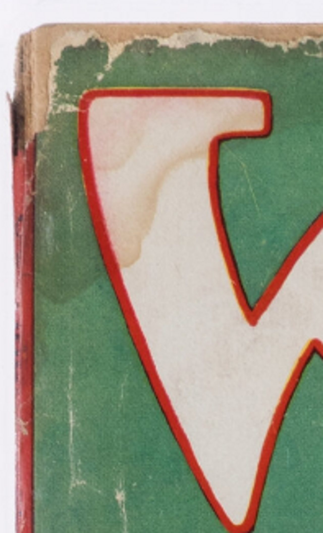 The top of the cover shows more wear in this copy, including more blunting in the corners and even some slight tearing in the upper left corner as well as some tearing along the top edge. Additionally, if you look closely, you can see a slight line just below the edge of the cover caused by its overhang.