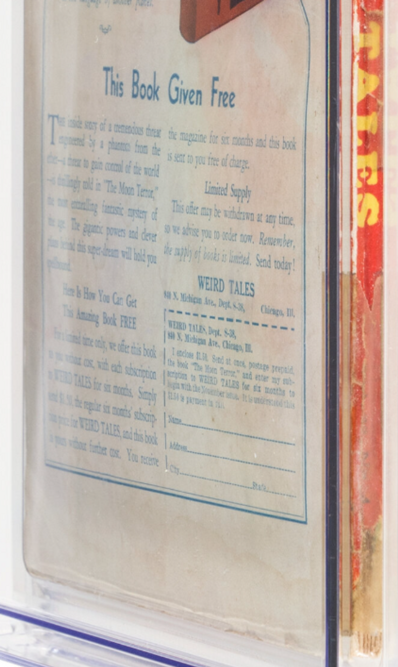You can clearly see the tape in these images as well. There is also quite a bit of creasing in the spine (where it isn’t covered by the tape). The cover over the spine is completely missing at the bottom and there's a large chunk of the spine at the top that is gone as well. The back cover is markedly faded and has well worn overhang damage. Overall, a copy like this is one to get if you don’t have the means for better looking copies and just want one for your collection. While pulps that look like this may be rare due solely to their age, they’re far from scarce.