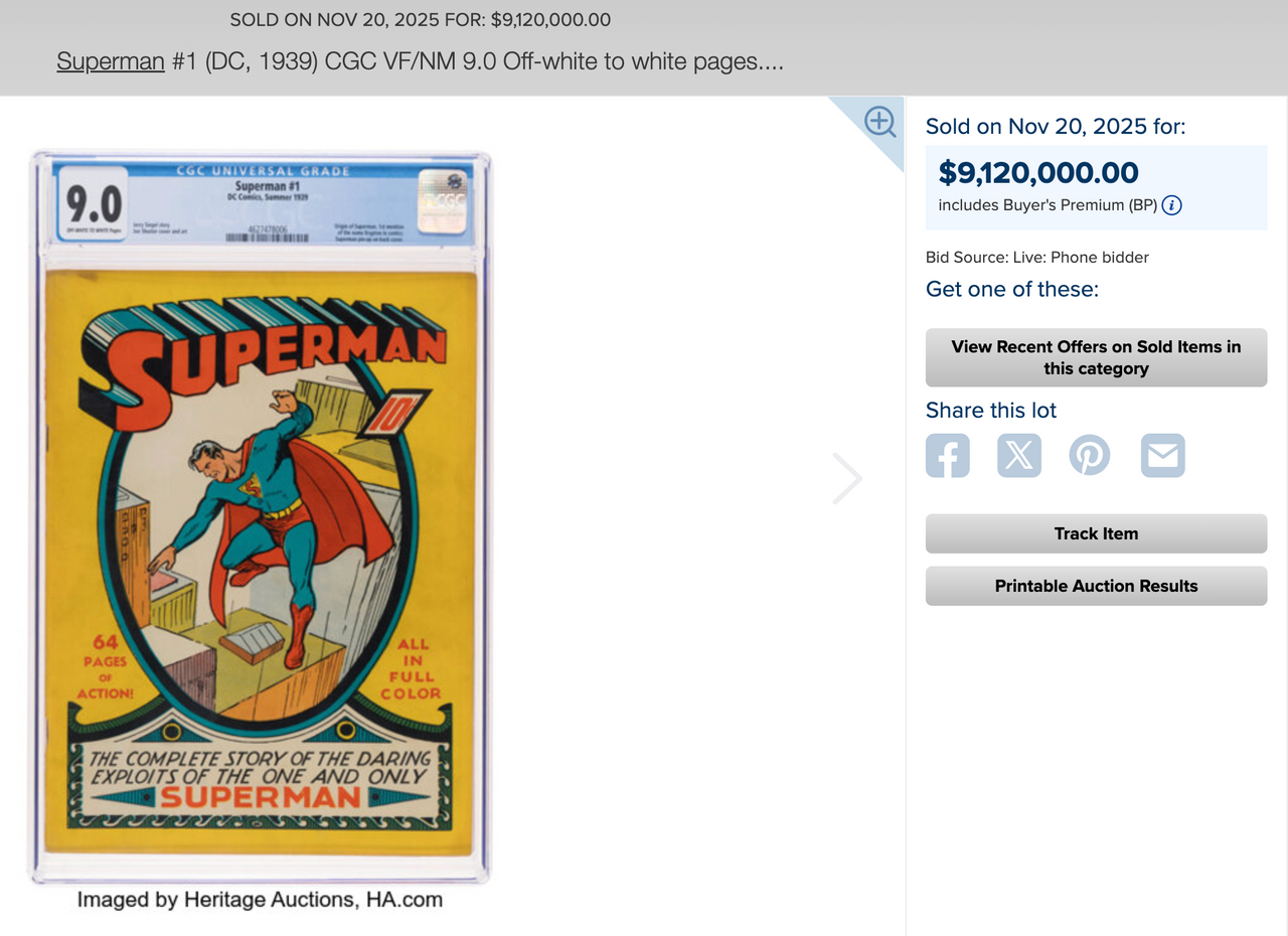 If I were an owner of one of these 9.0s, the $9.21 million sale for a Superman #1 would definitely encourage me to consign my copy to Heritage! In this current environment, we might very well see the first comic book sale to sell for more than $10 million.
