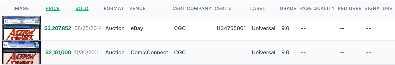 Will we ever see another comic sell for more than $9.12M? The only two candidates that come to mind are the two CGC 9.0s of Action Comics #1 that exist on the CGC Census. Both of these top-of-the-Census 9.0s have sold within the past 15 years for $2.16 million and $3.2 million: