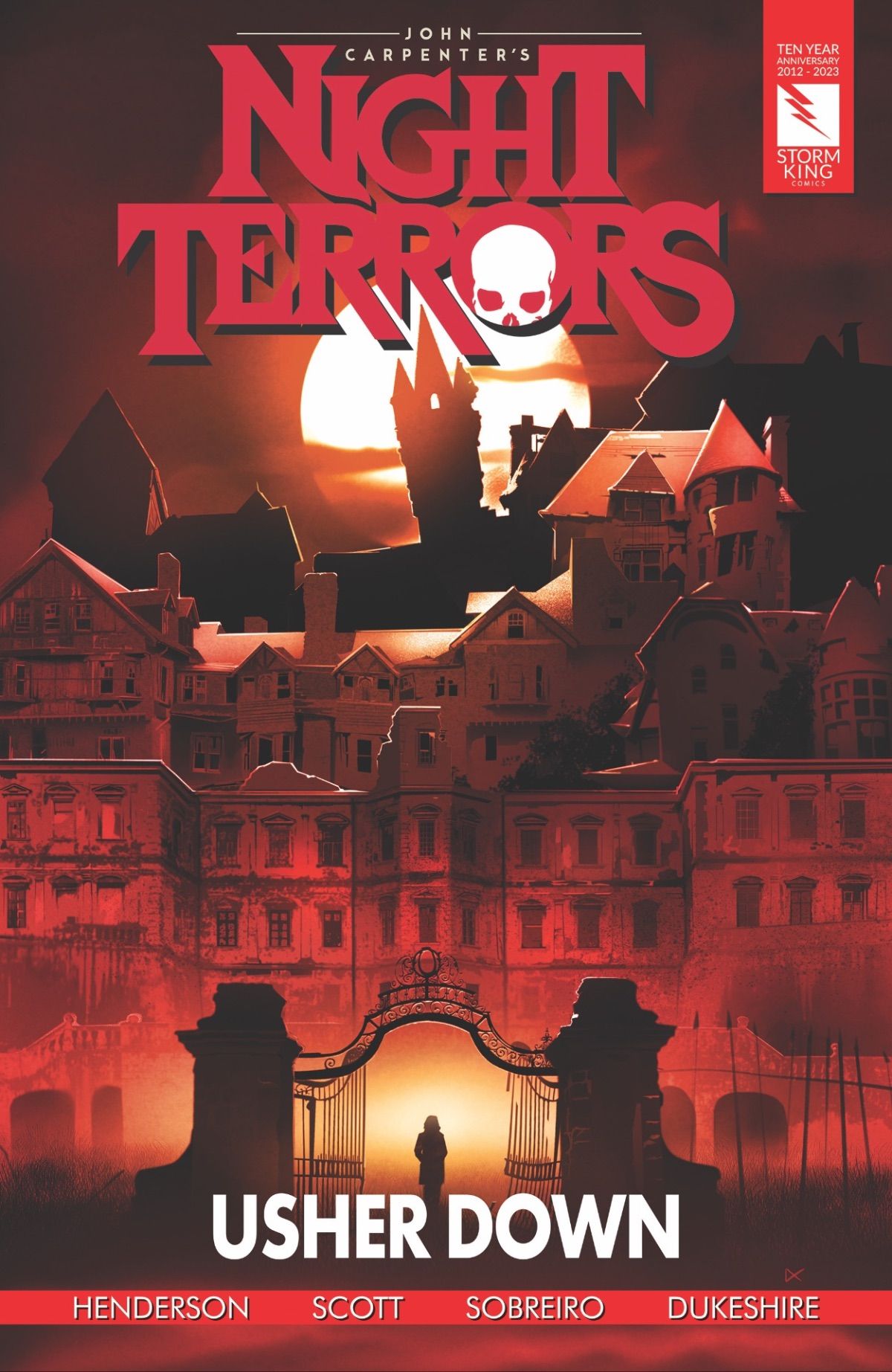 Written by Alex Van Helsing author Jason Henderson and illustrated by artist Greg Scott (Gotham Central, X-Files, Black Hood), with colors by Felipe Sobreiro and letters by Eisner and Harvey nominated letterer Ed Dukeshire, Usher Down kicks off the 2023 slate of the John Carpenter's Night Terrors imprint. The release coincides with the 10th anniversary celebration of Storm King Comics, the first comic book publishing company to be founded by a woman, producing legend Sandy King Carpenter, with multiple activations planned at this year's Comic-Con International.