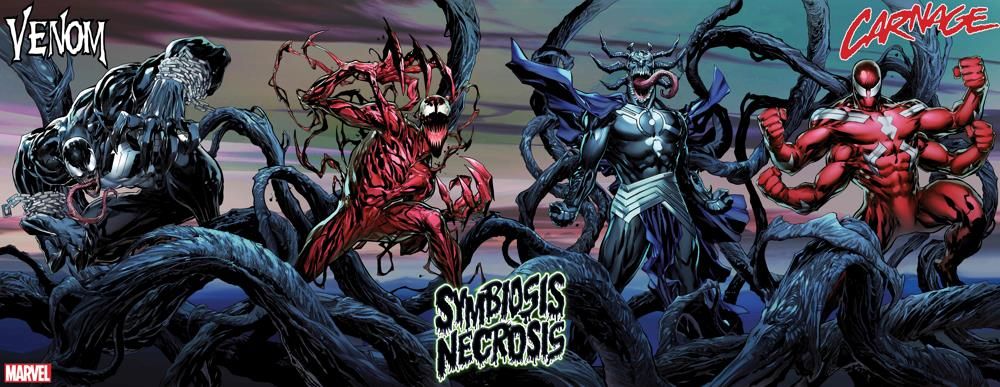 Media Release -- The family that stays together gets slayed together! Starting next month, enjoy a symbiote bloodbath for the ages as Marvel's two ongoing symbiote titles, VENOM and CARNAGE, play host to a vicious new saga, "Symbiosis Necrosis." The four-part crossover will unfold across VENOM #31-32 and CARNAGE #5-6.