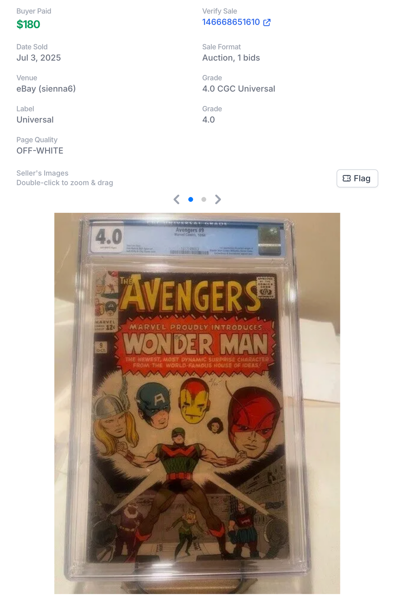 This single digit, Silver Age Avengers issue has a great cover that prominently features the first appearance of Wonder Man and is still inexpensive in comparison to some of its peers. Let's take a closer look at the most common grade on the CGC Census - a CGC 4.0 - to see what the sales data tells us. Prior to the "comic boom" of 2021, a 4.0 was selling in the $140 to $170 range. In June 2022, during the tail end of the comic boom, a 4.0 reached an all-time high of $408 before it plummeted in value along with the rest of the comic book market in 2023 and 2024. In my opinion, a 4.0 overcorrected with one copy selling for a measly $92.85 in September 2024, or about 40% below its pre-COVID values.