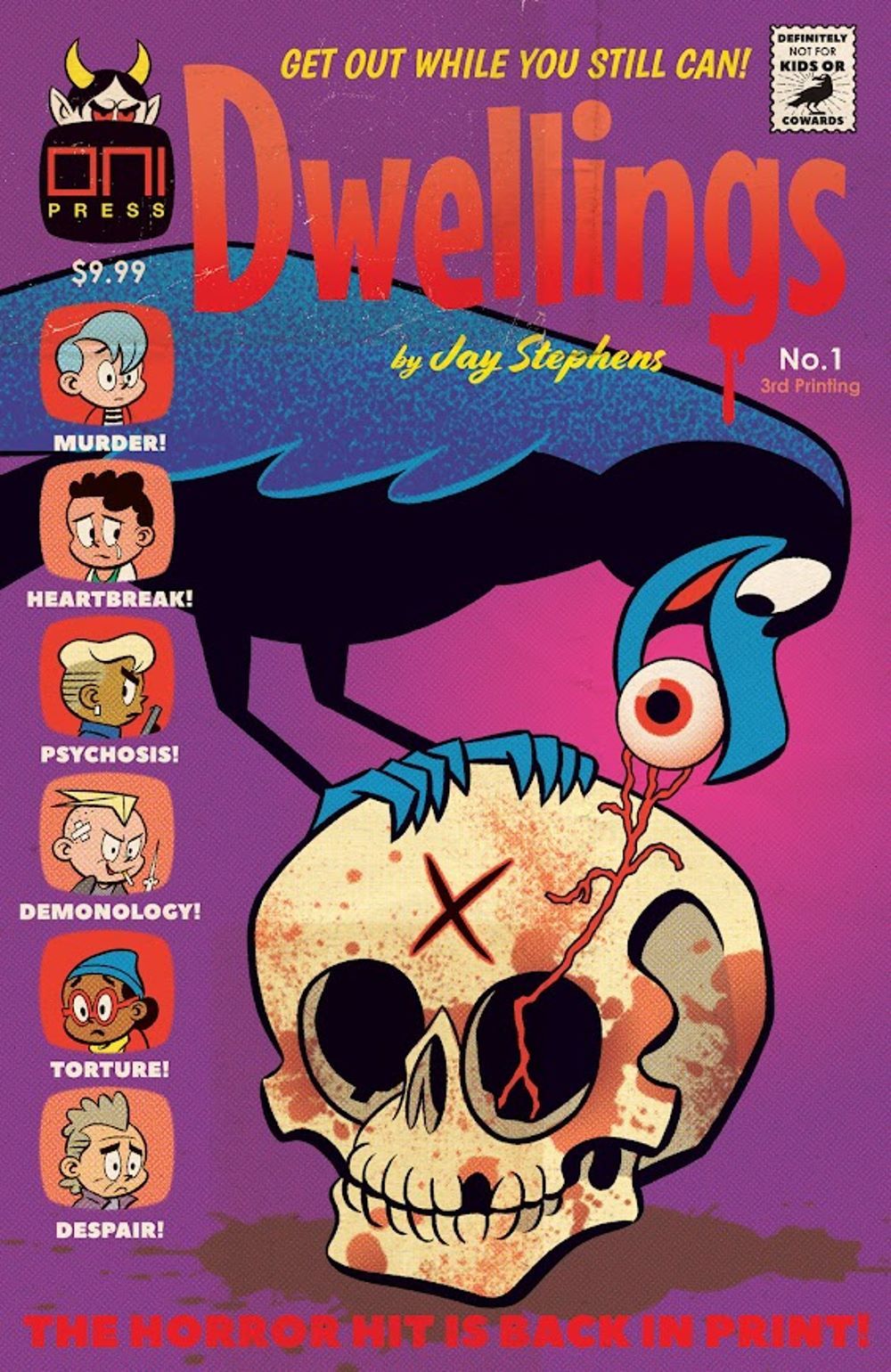 "Since day one, we've been committed to keeping DWELLINGS in print on a bi-monthly schedule, so it could find its audience and organically grow a following for its unique strain of nostalgia-slashing horror. But truth be told: Neither Oni or creator Jay Stephens ever imagined it would happen with this much velocity or force. We're incredibly grateful for the show of support that Direct Market retailers have put behind this series and will be taking all measures necessary to make sure we can meet demand for this weird and wonderful book that is truly unlike anything else on stands," said Oni Press President & Publisher Hunter Gorinson.