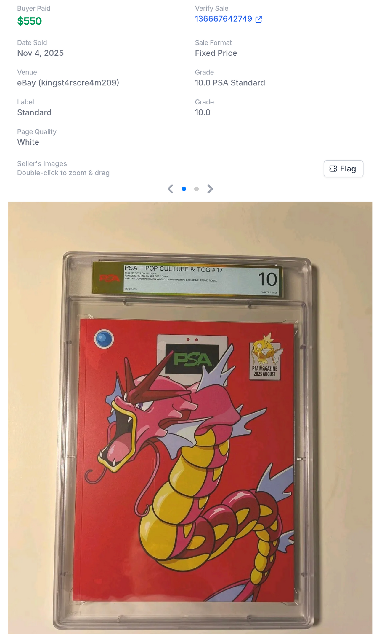 The most frequently graded magazine in PSA's Magazine Report is actually one of its own publications, PSA Magazine. Launched as Sports Market Report in 1995, it rebranded to PSA Magazine in January 2022 to broaden its focus beyond news about sports cards to include popular trading card games like Pokémon and video games. You'd think the most commonly graded copy of PSA Magazine would be the first issue which featured Charizard on its cover. Instead the most commonly graded magazine on PSA's Population Report is PSA Magazine #17 which features Shiny Gyarados instead. PSA has already graded 129 copies of this issue. There are already two 10s in the Population Report. Both of which sold in November 2025 for around $550: