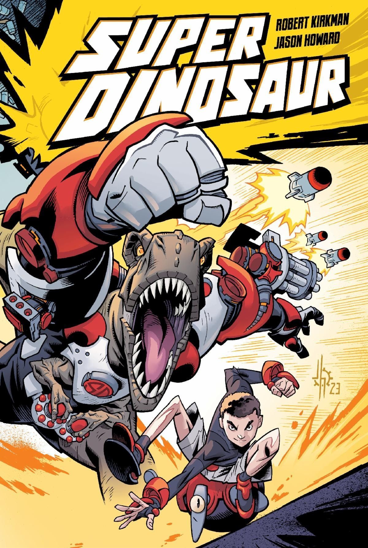 Media Release -- Today Skybound Comet officially announced Super Dinosaur Compendium One, which collects the hit series from the superstar team of writer Robert Kirkman (Invincible, The Walking Dead) and artist Jason Howard (Batman, The Flash) for the first time in one single volume for Middle Grade readers. The complete volume will be available at comic book shops and everywhere books are sold July 2024.