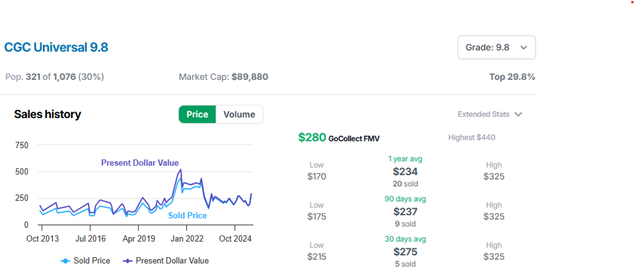 And that's when you look for a breakout sale that pushes past previous resistance levels (around $265 in this case). I think we saw that breakout sale just a few weeks ago when this CGC 9.8 (with an older label) sold on eBay for $325:
