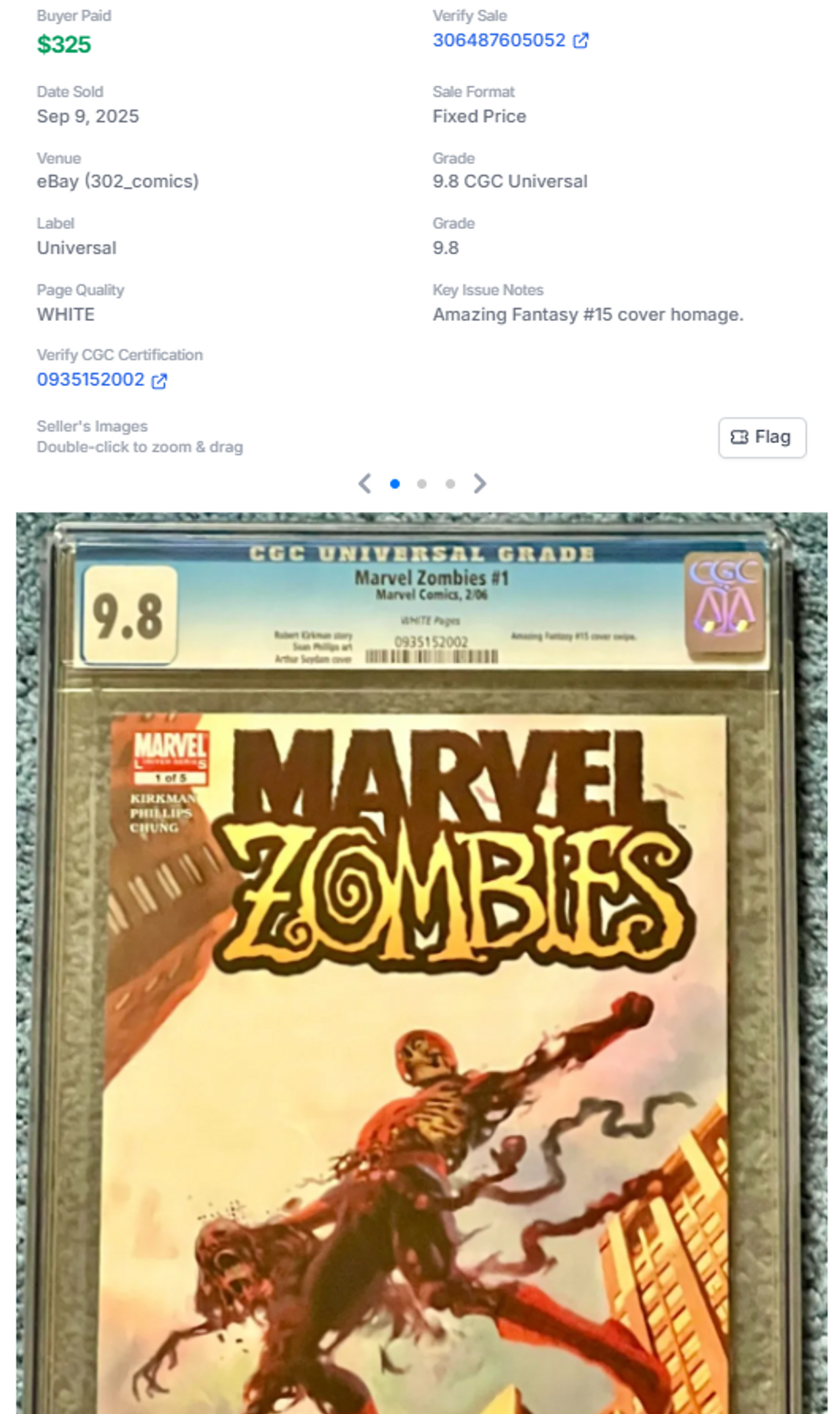 In addition, high-grade copies of Marvel Zombies are not that easy to find. It had a very small print run; according to Comichron’s March 2006 “Top 300,” the number of copies of Marvel Zombies #1 that comic book shops ordered through Diamond Comic Distributors (the exclusive comic book distributor for Marvel at the time) was only 19,047. Not surprisingly, because of this small print run, there aren't many graded copies of this issue on the CGC Census; there are only 1,492 total copies on the CGC Census and 461 universal blue label 9.8s. This pales in comparison to other Modern Age keys which may have tens of thousands of graded copies.